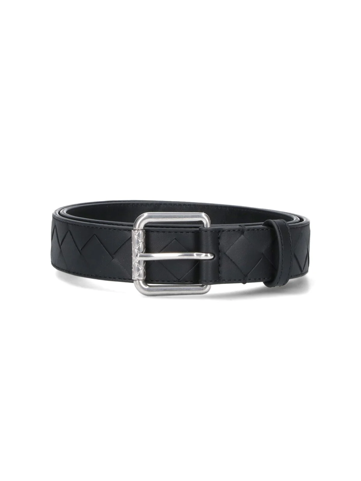BOTTEGA VENETA INTRECCIATO BELT IN BLACK LEATHER WITH SILVER METAL BUCKLE AT THE FRONT, ADJUSTABLE. PRODUCT INFO PRODUCT CODE 855892 VCPQ48803 COMPOSITION: 100% LEATHER SIZE AND FIT: HEIGHT: 3.5 CM MADE IN: ITALY