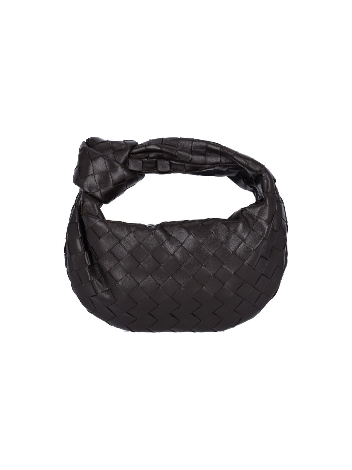 BOTTEGA VENETA 'JODIE' MINI BAG IN BROWN WOVEN LEATHER WITH TOP HANDLE, ICONIC KNOT DETAIL, ZIP CLOSURE, SINGLE COMPARTMENT. PRODUCT INFO PRODUCT CODE 651876 VCPP52132 COMPOSITION: 100% LAMB LEATHER SIZE AND FIT: H 23 X W 28 X D 8 CM MADE IN: ITALY - HANDLE DROP: 10 CM