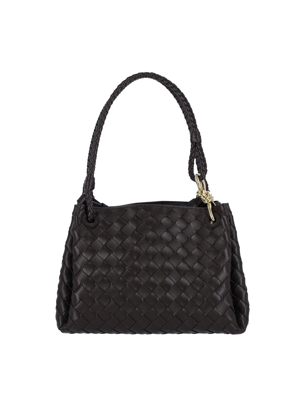 BOTTEGA VENETA MEDIUM "PARACHUTE" HANDBAG IN BROWN LAMBSKIN WITH "INTRECCIATO" PATTERN, TWO HANDLES, GOLD METAL "KNOT" LOGO CHARM DETAIL, REMOVABLE SHOULDER STRAP, MAGNETIC CLOSURE, A SINGLE INNER COMPARTMENT. PRODUCT INFO PRODUCT CODE 835921 VCPPT2190 COMPOSITION: 100% LAMBSKIN SIZE AND FIT: H 18.5 X W 29.5 X D 17.5 CM MADE IN: ITALY - HANDLE DROP: 22 CM