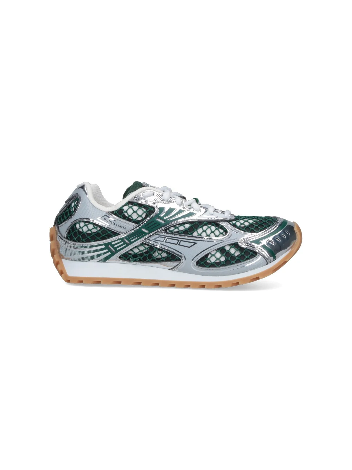 BOTTEGA VENETA "ORBIT" SNEAKERS IN GREEN MESH WITH SILVER DETAILS, ROUND TOE, LACE-UP CLOSURE, LOGO PATCH ON THE TONGUE, SILVER LOGO PRINT ON THE SIDE, TEXTURED RUBBER SOLE. PRODUCT INFO PRODUCT CODE 755915 V2X403031 COMPOSITION: 62% POLYURETHANE, 27% POLYESTER, 11% RUBBER MADE IN: ITALY - SOLE: 100% RUBBER