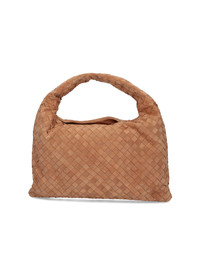 BOTTEGA VENETA 'HOP' SMALL BAG IN BROWN SUEDE WITH INTRECCIATO PATTERN, HANDLE, MAGNETIC CLOSURE, INNER ZIP POCKET, MAIN INNER COMPARTMENT. PRODUCT INFO PRODUCT CODE 796262 V1QE32599 COMPOSITION: 100% CALF LEATHER SIZE AND FIT: H 21 X W 46 X D 10 CM MADE IN: ITALY - HANDLE DROP: 20 CM