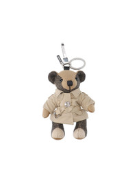 BURBERRY 'THOMAS' BEAR KEYRING CHARM IN BEIGE CASHMERE WITH STRAP, GOLD METAL NAMEPLATE, ENGRAVED LOGO DETAIL, SILVER METAL RING KEYRING, CARABINER CLOSURE. PRODUCT INFO PRODUCT CODE 8112771A7026 COMPOSITION: 100% CASHMERE MADE IN: CHINA