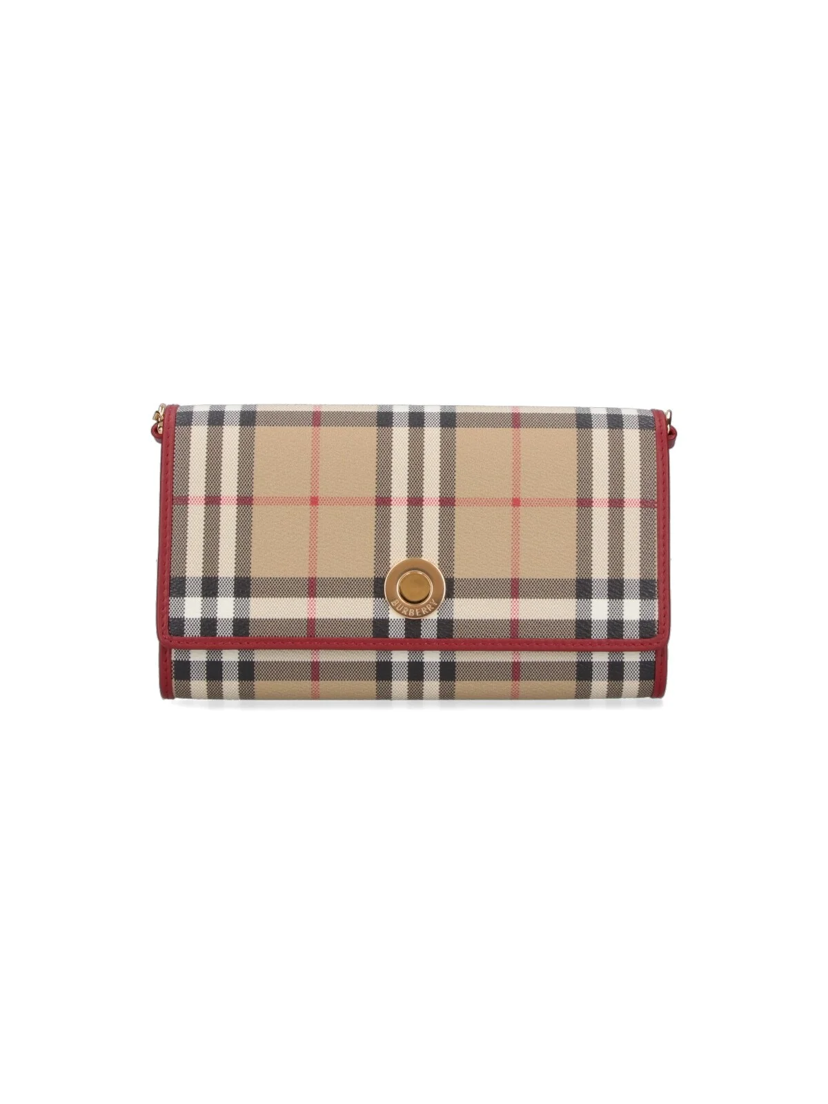 BURBERRY 'CHECK' CHAIN WALLET IN BEIGE FABRIC WITH ALL-OVER 'CHECK' LOGO PATTERN, FRONT FLAP CLOSURE, GOLD METAL SHOULDER STRAP, ONE INNER ZIP POCKET, CARD SLOTS, TWO MAIN INNER COMPARTMENTS. PRODUCT INFO PRODUCT CODE 8116321B9724 COMPOSITION: 55% POLYURETHANE, 25% POLYESTER, 20% COTTON SIZE AND FIT: H 12 X W 20.5 X D 3.5 CM MADE IN: MOLDOVA - TRIMS: 100% METAL - STRAP DROP: 55 CM