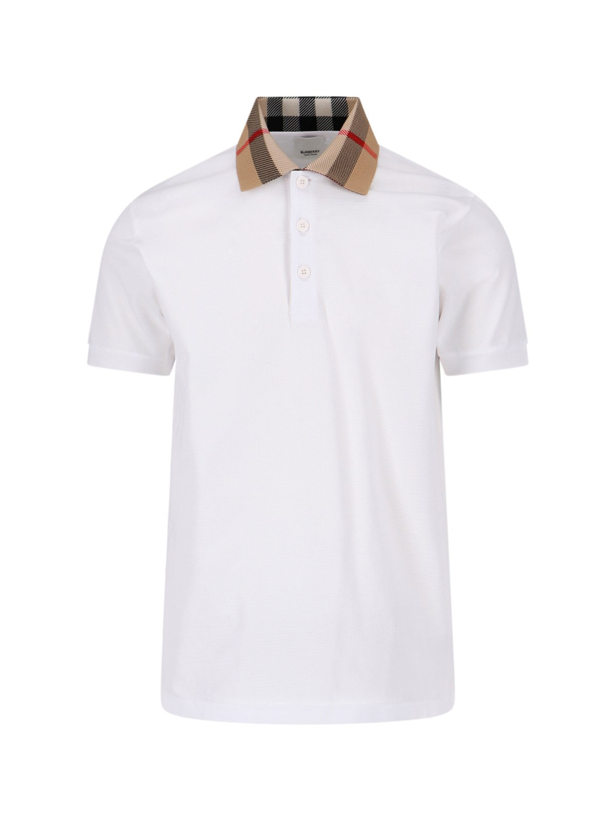 BURBERRY CHECK COLLAR POLO SHIRT IN WHITE COTTON WITH BEIGE CHECK COLLAR, FRONT BUTTONS, AND STRAIGHT HEM. PRODUCT INFO PRODUCT CODE 8071621A1464 COMPOSITION: 100% COTTON SIZE AND FIT: SLIM MADE IN: PORTOGALLO