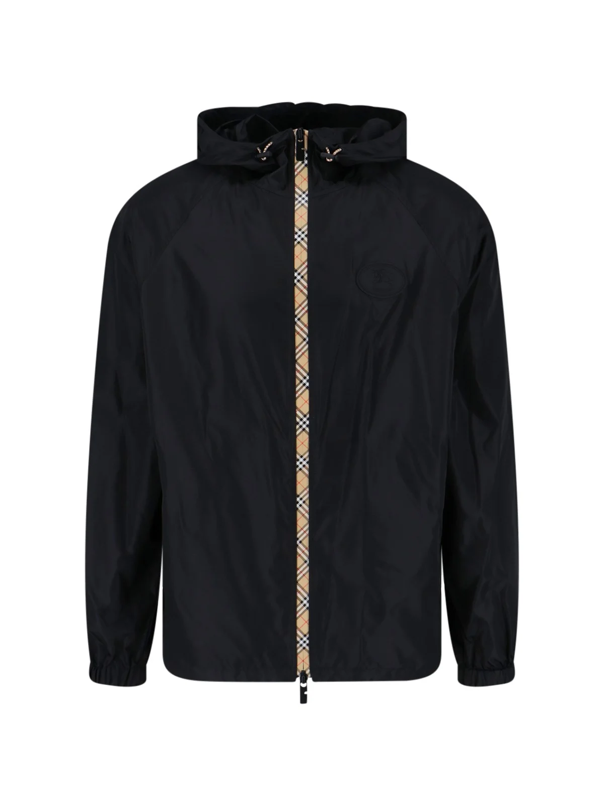 BURBERRY CHECK JACKET IN BLACK FABRIC WITH ADJUSTABLE DRAWSTRING HOOD, ZIP CLOSURE, LONG SLEEVES, CHECK RIBBON ON THE FRONT, TONE-ON-TONE LOGO PATCH ON THE FRONT, TWO SIDE POCKETS, ELASTIC WAIST AND CUFFS, AND STRAIGHT HEM. PRODUCT INFO PRODUCT CODE 8120369A1189 COMPOSITION: 100% POLYAMIDE SIZE AND FIT: REGULAR FIT MADE IN: THAILAND