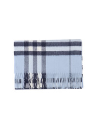 BURBERRY 'CHECK' SCARF IN LIGHT BLUE BRUSHED CASHMERE WITH ICONIC ALL-OVER LOGO INTARSIA PATTERN, WHITE LOGO LABEL ON THE BACK, RECTANGULAR FRINGES ON THE BOTTOM. PRODUCT INFO PRODUCT CODE 8112636C3263 COMPOSITION: 100% CASHMERE SIZE AND FIT: H 168 X W 30 CM MADE IN: UNITED KINGDOM