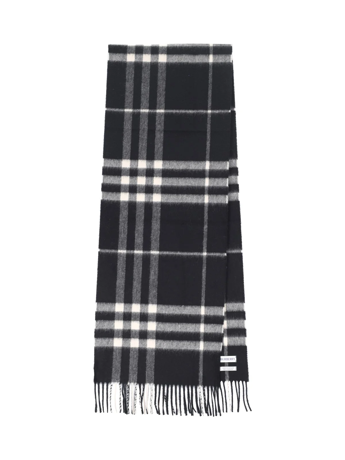 BURBERRY 'CHECK' SCARF IN BLACK BRUSHED CASHMERE WITH ICONIC ALL-OVER LOGO INTARSIA PATTERN, CONTRASTING LOGO LABEL ON THE BACK, FRINGED HEM, RECTANGULAR SHAPE. PRODUCT INFO PRODUCT CODE 8094741C1343 COMPOSITION: 100% CASHMERE SIZE AND FIT: H 168 X W 30 CM MADE IN: UNITED KINGDOM