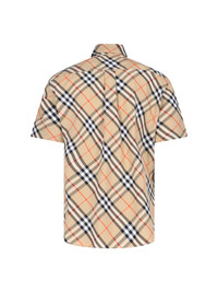BURBERRY 'CHECK' BEIGE COTTON SHIRT WITH WHITE, BLACK AND RED DETAILS, CLASSIC COLLAR, BUTTON CLOSURE, SHORT SLEEVES, BACK PENCE DETAIL, STRAIGHT HEM. PRODUCT INFO PRODUCT CODE 8087637B9368 COMPOSITION: 100% COTTON SIZE AND FIT: REGULAR MADE IN: PORTOGALLO