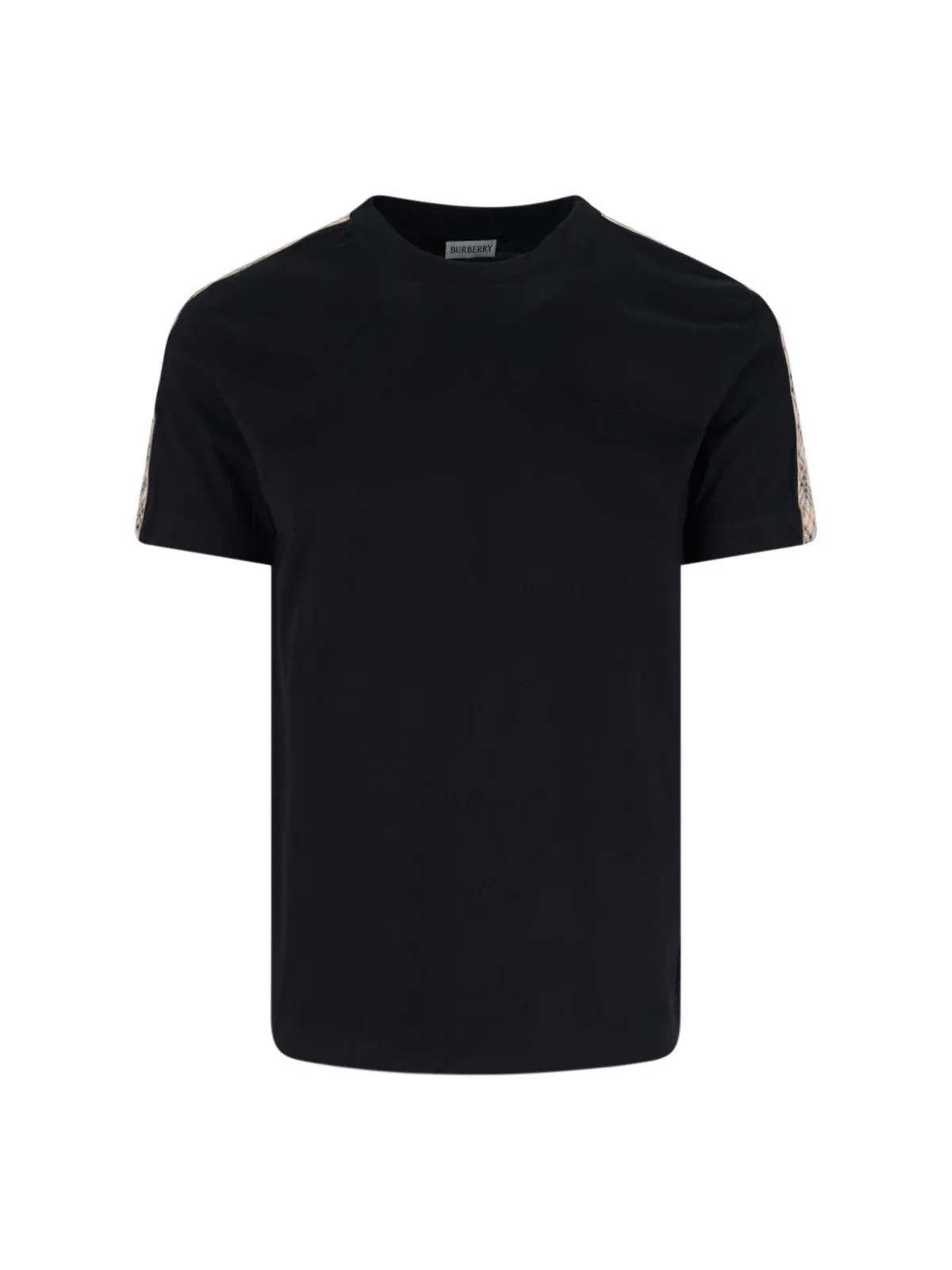 BURBERRY 'CHECK' BLACK COTTON CREW NECK T-SHIRT WITH BEIGE FABRIC INSERTS ON THE SLEEVES, ICONIC MULTICOLOR PATTERN DETAIL, STRAIGHT HEM. PRODUCT INFO PRODUCT CODE 8106248A1189 COMPOSITION: 100% COTTON SIZE AND FIT: REGULAR FIT MADE IN: VIETNAM