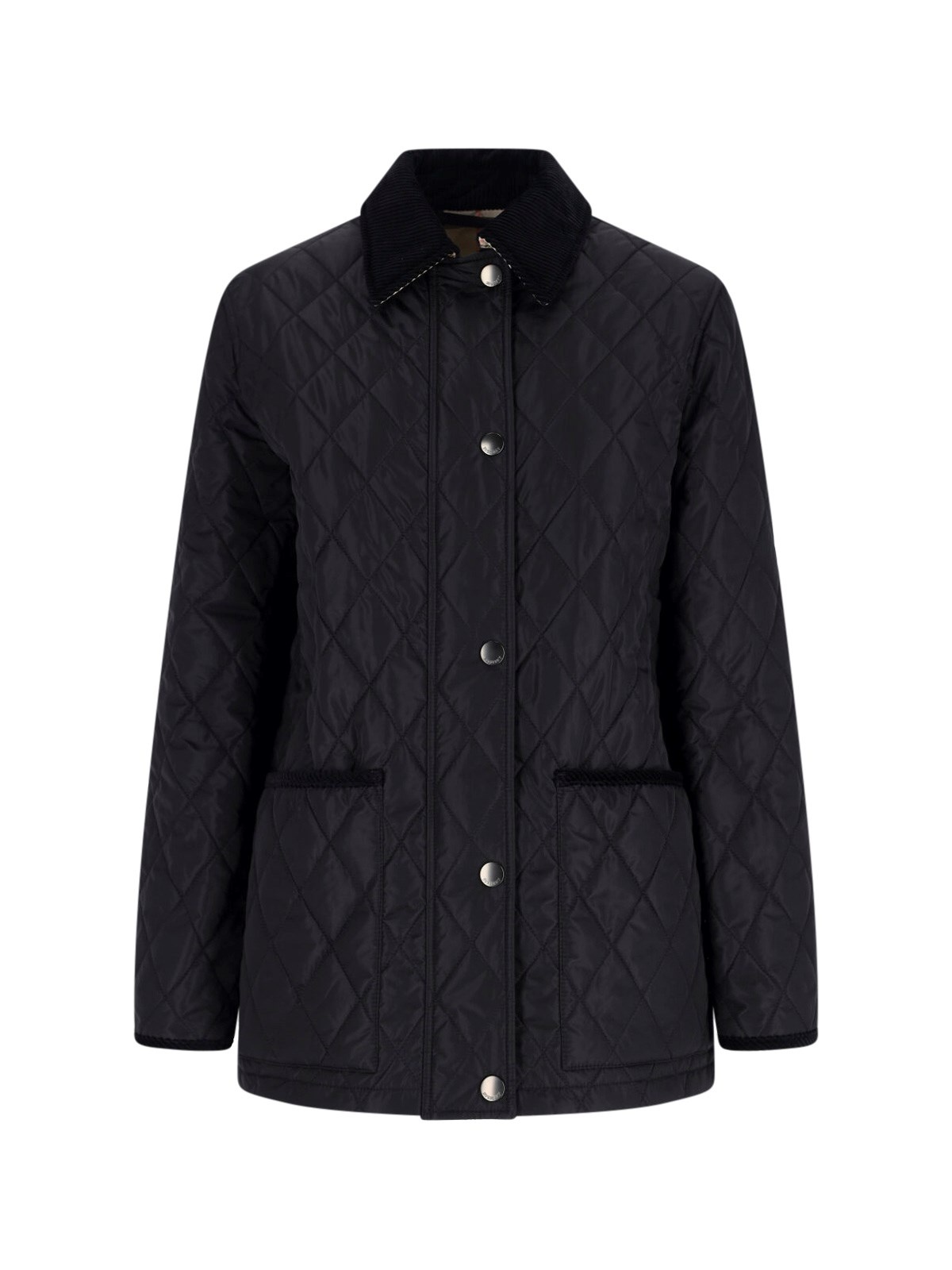 BURBERRY DIAMOND QUILTED JACKET IN BLACK NYLON WITH CLASSIC CORDUROY COLLAR, BUTTON CLOSURE, TWO SIDE FLAT POCKETS, AND STRAIGHT HEM. PRODUCT INFO PRODUCT CODE 8107463C1900 COMPOSITION: 100% POLYAMIDE SIZE AND FIT: REGULAR FIT MADE IN: THAILAND