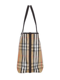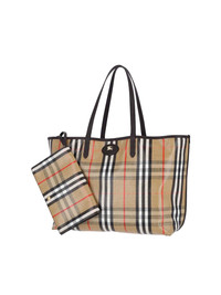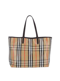BURBERRY HIGHLANDS MEDIUM TOTE BAG IN VISCOSE COTTON AND BEIGE LINEN, CALF LEATHER TRIM, MULTICOLOR CHECK PATTERN, TWO HANDLES, SNAP BUTTON STRAP CLOSURE, REMOVABLE INNER POUCH, SNAP BUTTON FLAP CLOSURE DETAIL, SINGLE INNER COMPARTMENT. PRODUCT INFO PRODUCT CODE 8112222B9368 COMPOSITION: 69% COTTON, 21% VISCOSE, 10% LINEN SIZE AND FIT: H 37 X W 39 X D 17 CM MADE IN: ITALY - HANDLE DROP: 24 CM