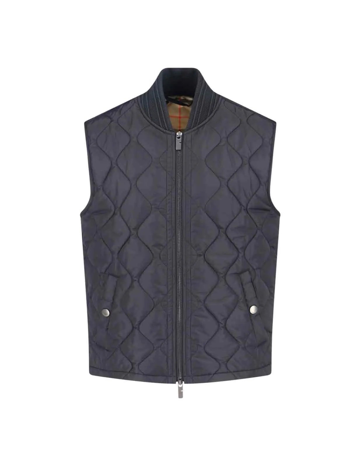 BURBERRY QUILTED VEST IN BLACK FABRIC WITH RIBBED COLLAR, DIAMOND PATTERN, DOUBLE ZIP CLOSURE, TWO SIDE BUTTON FLAP POCKETS, SIDE LOGO LABEL, TWO INNER FLAT POCKETS, CHECK LINING, STRAIGHT HEM. PRODUCT INFO PRODUCT CODE 8110185A1189 COMPOSITION: 100% POLYAMIDE SIZE AND FIT: REGULAR FIT MADE IN: THAILAND
