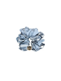 BURBERRY 'CHECK' SILK SCRUNCHIE IN LIGHT BLUE AND CURLED WITH GOLD METAL CHRAM DETAIL AND LOGO EMBOSSED AT THE BACK OF THE FRONT. PRODUCT INFO PRODUCT CODE 8119729C3263 COMPOSITION: 100% MULBERRY SILK MADE IN: ITALY