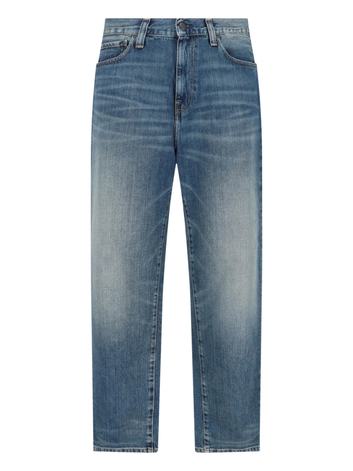 CARHARTT WIP AARON JEANS IN BLUE COTTON DENIM WITH DISTRESSED WASH, MID WAIST, BELT LOOPS, FIVE-POCKET DESIGN, BUTTON AND ZIP CLOSURE, LEATHER LOGO PATCH ON THE BACK, STRAIGHT LEG. PRODUCT INFO PRODUCT CODE I036728014Q COMPOSITION: 100% COTTON SIZE AND FIT: REGULAR FIT MADE IN: TUNISIA