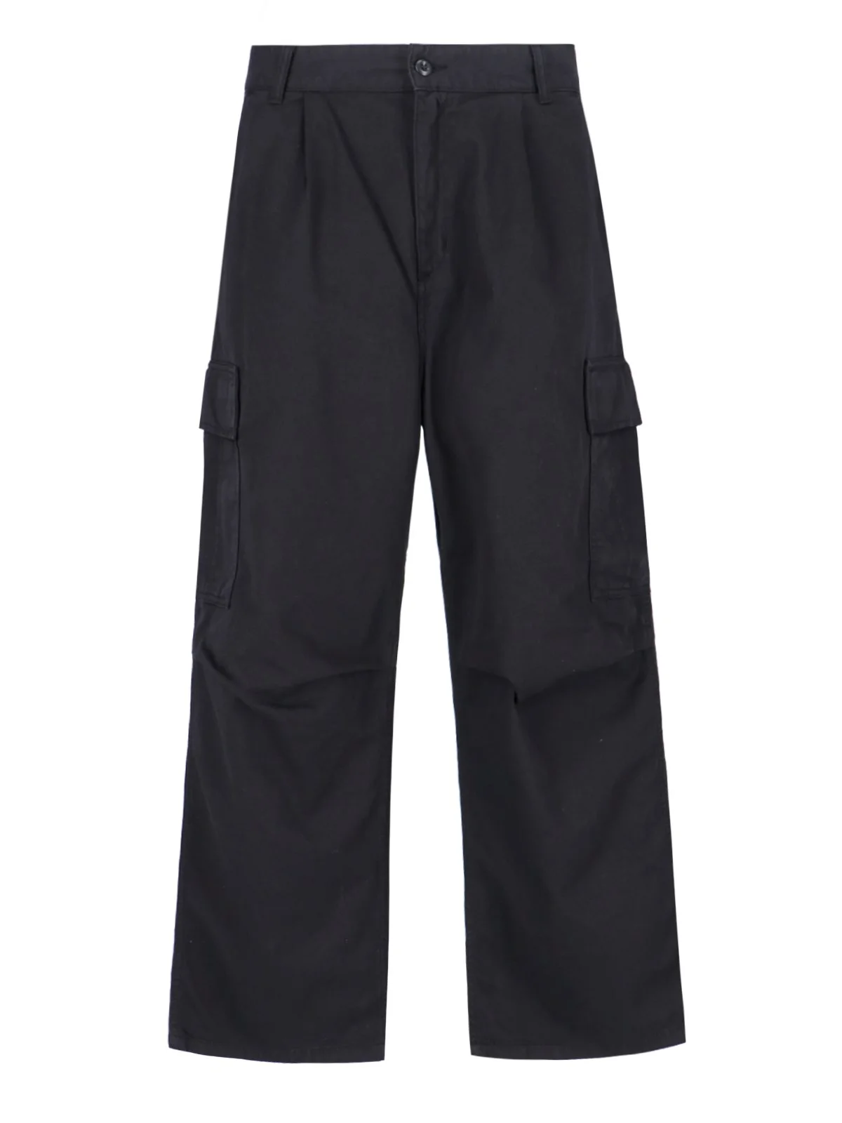 CARHARTT WIP "COLE" TWILL CARGO PANTS IN BLACK COTTON WITH MEDIUM WAIST, BELT LOOPS, BUTTON AND ZIP CLOSURE, TWO FRONT PLEATS, TWO FRONT CARGO POCKETS, GOLD LOGO LABEL APPLICATION DETAIL, TWO SIDE FLAT POCKETS, TWO BACK FLAP POCKETS, WIDE LEG, REINFORCED KNEE DETAIL. PRODUCT INFO PRODUCT CODE I03121889GD COMPOSITION: 100% COTTON SIZE AND FIT: SOFT FIT MADE IN: TUNISIA - DENIM SIZE SCALE