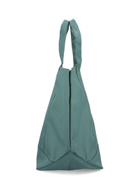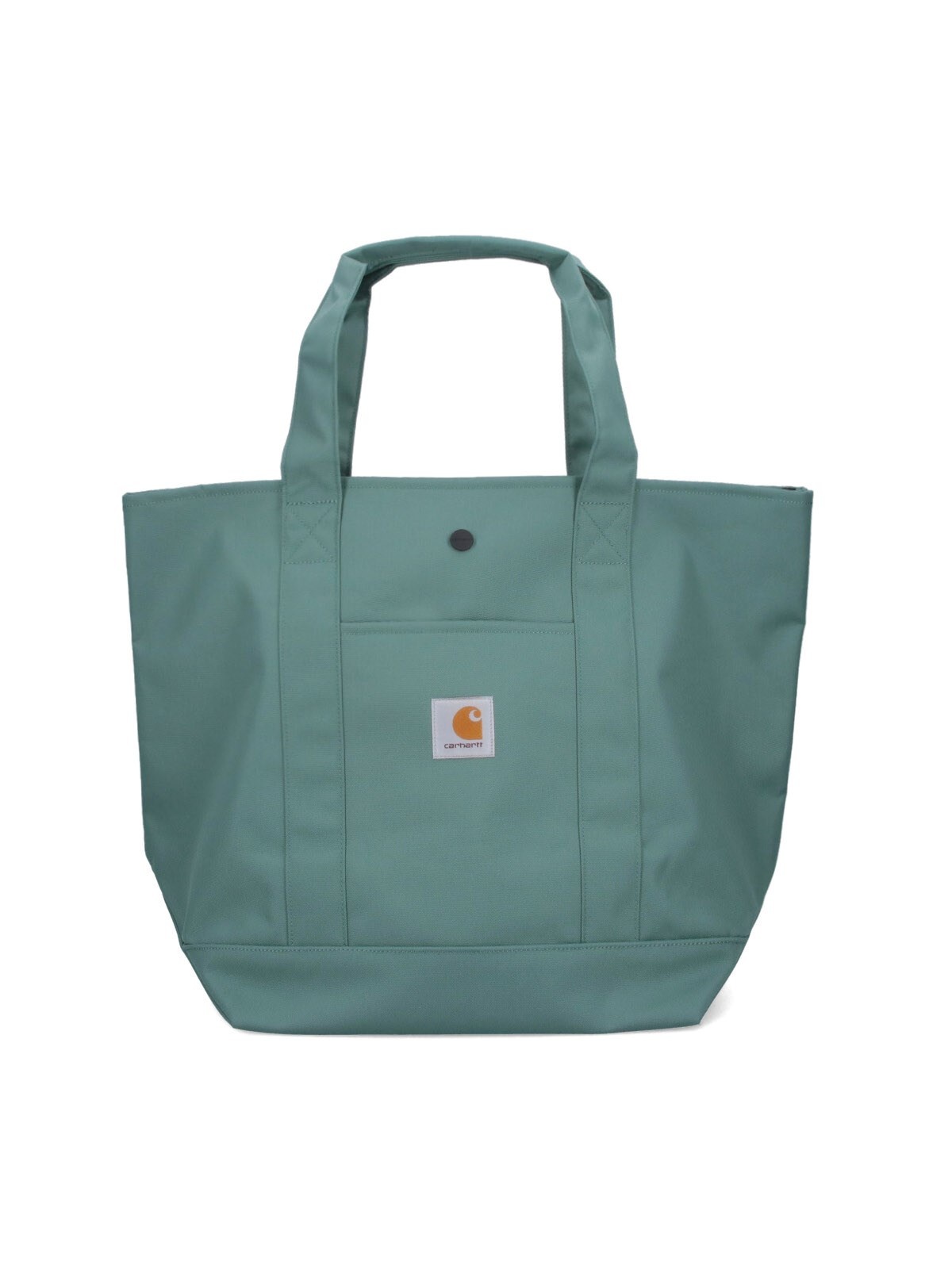 CARHARTT WIP JACOB TOTE BAG IN GREEN FABRIC IN AQUA SHADES, TWO HANDLES, SNAP BUTTON CLOSURE, FLAT FRONT POCKET, LOGO LABEL DETAIL, MAXI INNER FLAT POCKET, AND MAIN INNER COMPARTMENT. PRODUCT INFO PRODUCT CODE I0345932M2XX COMPOSITION: 100% POLYESTER SIZE AND FIT: H 36 X W 51 X D 22 CM MADE IN: VIETNAM - PRODUCT MADE FROM RECYCLED MATERIALS