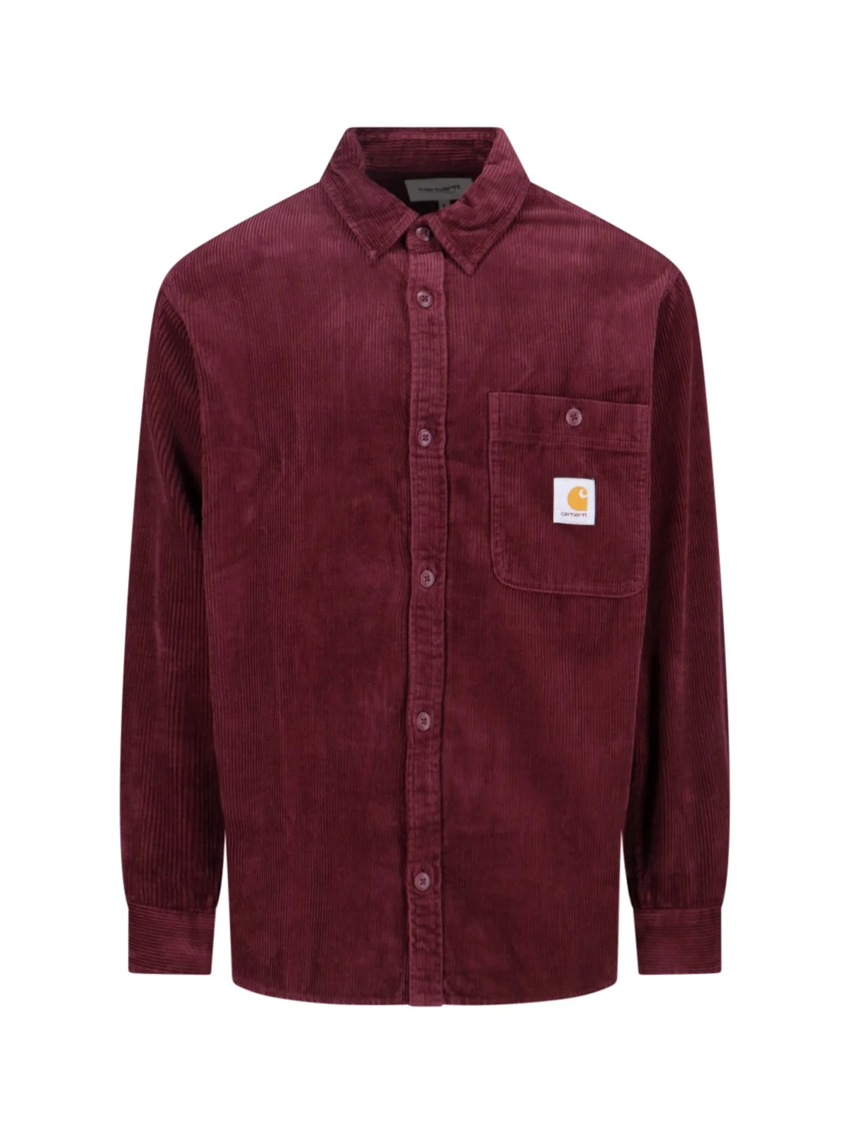 CARHARTT WIP L/S FLINT JACKET IN BURGUNDY COTTON WITH RIBBED PATTERN, CLASSIC COLLAR, BUTTON CLOSURE, FRONT BUTTON POCKET, CONTRASTING LOGO LABEL DETAIL ON THE FRONT, BUTTON CUFFS, CURVED HEM. PRODUCT INFO PRODUCT CODE I03583733KXX COMPOSITION: 100% COTTON SIZE AND FIT: REGULAR FIT MADE IN: CAMBODIA