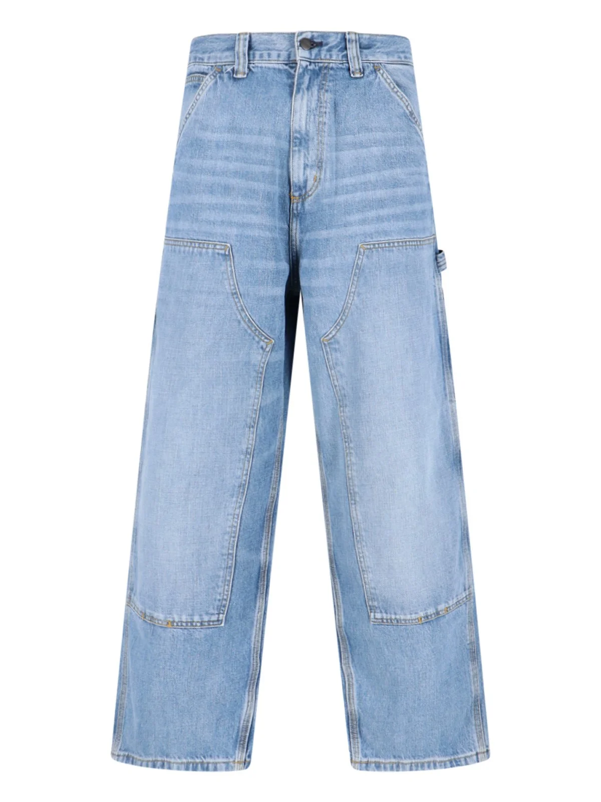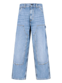 CARHARTT WIP "OG DOUBLE KNEE" PANTS IN LIGHT BLUE DENIM WITH MID WAIST, BELT LOOPS, BUTTON AND ZIP CLOSURE, TWO FRONT POCKETS, PANEL DETAIL ON THE FRONT, TWO BACK POCKETS WITH LOGO LABEL DETAIL, TWO CARGO POCKETS, HAMMER HOLDER LOOP DETAIL, WIDE LEG. PRODUCT INFO PRODUCT CODE I03579701UR COMPOSITION: 100% COTTON SIZE AND FIT: OVERSIZED FIT MADE IN: TURKEY