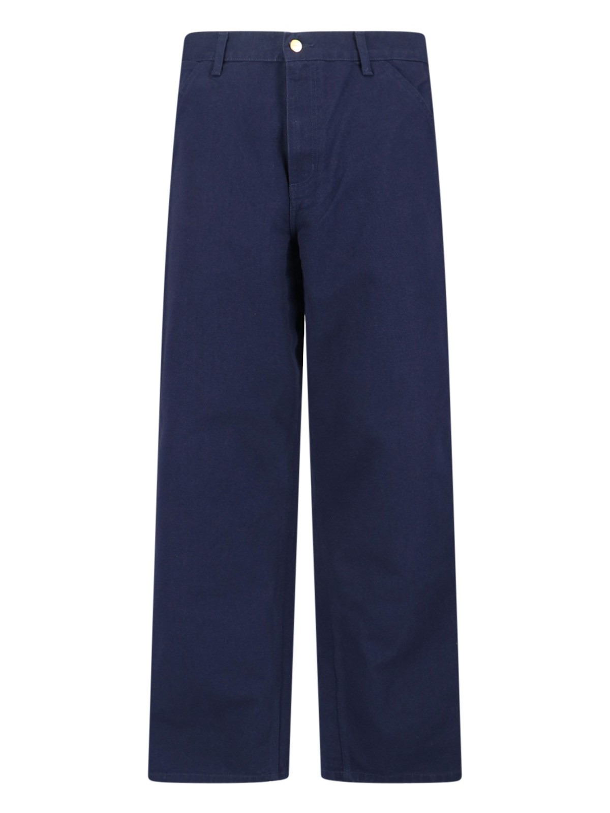 CARHARTT WIP SINGLE KNEE BLUE COTTON CARPENTER PANTS WITH MEDIUM WAIST, BELT LOOPS, BUTTON AND ZIP CLOSURE, TWO SIDE FLAT POCKETS, HAMMER LOOP AND SIDE TOOL POCKET, SEVERAL FLAT BACK POCKETS, GOLD LOGO LABEL ON THE BACK, STRAIGHT LEG. PRODUCT INFO PRODUCT CODE I0314971C02 COMPOSITION: 100% ORGANIC COTTON SIZE AND FIT: - SOFT FIT MADE IN: TUNISIA - "DENIM" SIZE SCALE - PRODUCT MADE FROM RECYCLED MATERIALS
