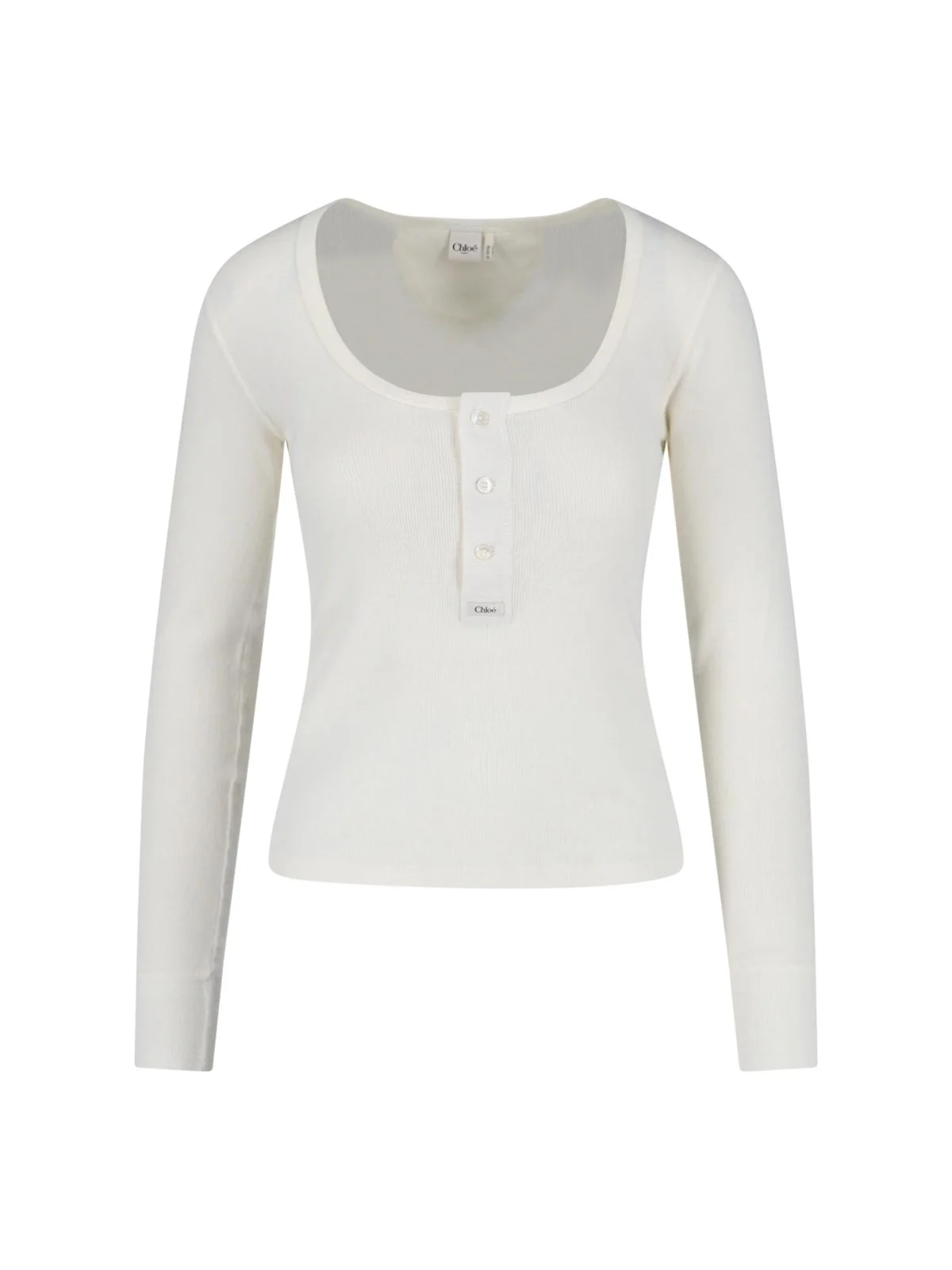 CHLOE WHITE COTTON RIBBED SWEATER WITH ROUND NECKLINE, FRONT BUTTON CLOSURE, FRONT LOGO PATCH, TONE-ON-TONE EMBROIDERY DETAIL ON THE BACK, LONG SLEEVES. PRODUCT INFO PRODUCT CODE 26SJH29185107 COMPOSITION: 100% COTTON SIZE AND FIT: SLIM FIT MADE IN: PORTUGAL
