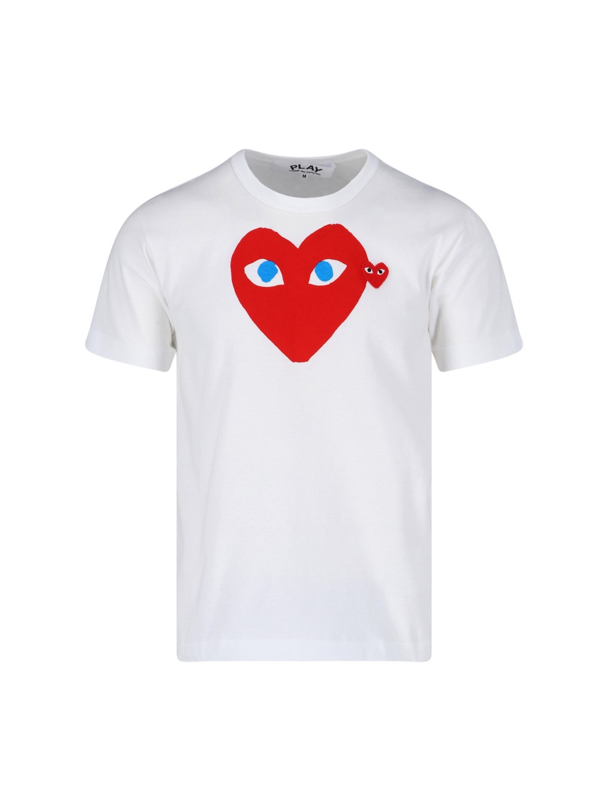 COMME DES GARCONS PLAY DOUBLE LOGO T-SHIRT IN WHITE COTTON WITH RIBBED CREW NECK, SHORT SLEEVES, RED LOGO PATCH ON THE CHEST, RED LOGO PRINT WITH LIGHT BLUE DETAILS ON THE FRONT, STRAIGHT HEM. PRODUCT INFO PRODUCT CODE AX T086 0511 SIZE AND FIT: REGULAR FIT
