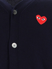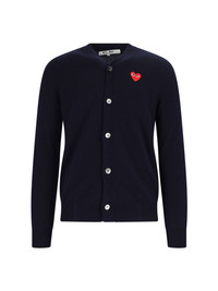 COMMES DES GARCONS PLAY LOGO CARDIGAN IN BLACK WOOL WITH V-NECK, BUTTON CLOSURE, RED LOGO PATCH ON THE CHEST, RIBBED TRIMS, STRAIGHT HEM. PRODUCT INFO PRODUCT CODE AX N008 0512 COMPOSITION: 100% WOOL SIZE AND FIT: REGULAR FIT MADE IN: JAPAN