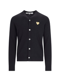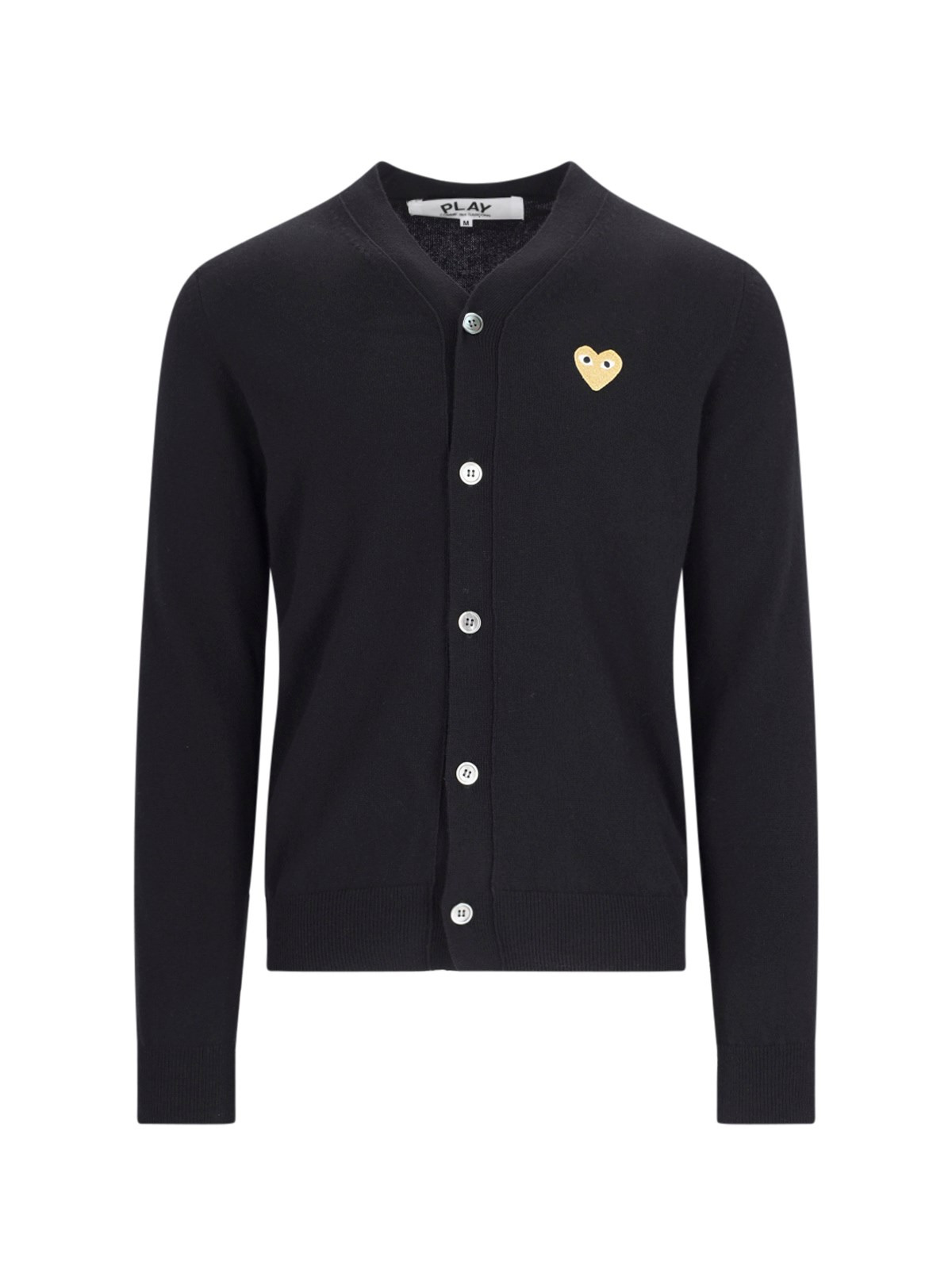 COMME DES GARCONS PLAY LOGO CARDIGAN IN BLACK WOOL WITH V-NECK, BUTTON CLOSURE, YELLOW LOGO PATCH ON THE CHEST, RIBBED TRIMS, STRAIGHT HEM. PRODUCT INFO PRODUCT CODE AX N050 0511 COMPOSITION: 100% WOOL SIZE AND FIT: REGULAR FIT MADE IN: JAPAN