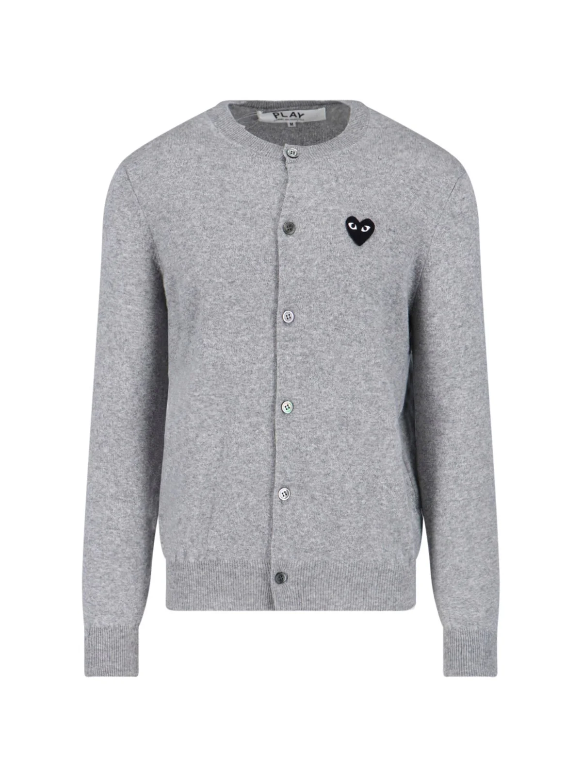 COMME DES GARCONS PLAY GREY WOOL CARDIGAN WITH CREW NECK, BUTTON CLOSURE, LOGO DETAIL EMBROIDERED ON THE FRONT, RIBBED TRIMS, STRAIGHT HEM. PRODUCT INFO PRODUCT CODE AX N023 0512 COMPOSITION: 100% WOOL SIZE AND FIT: REGULAR FIT MADE IN: JAPAN