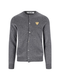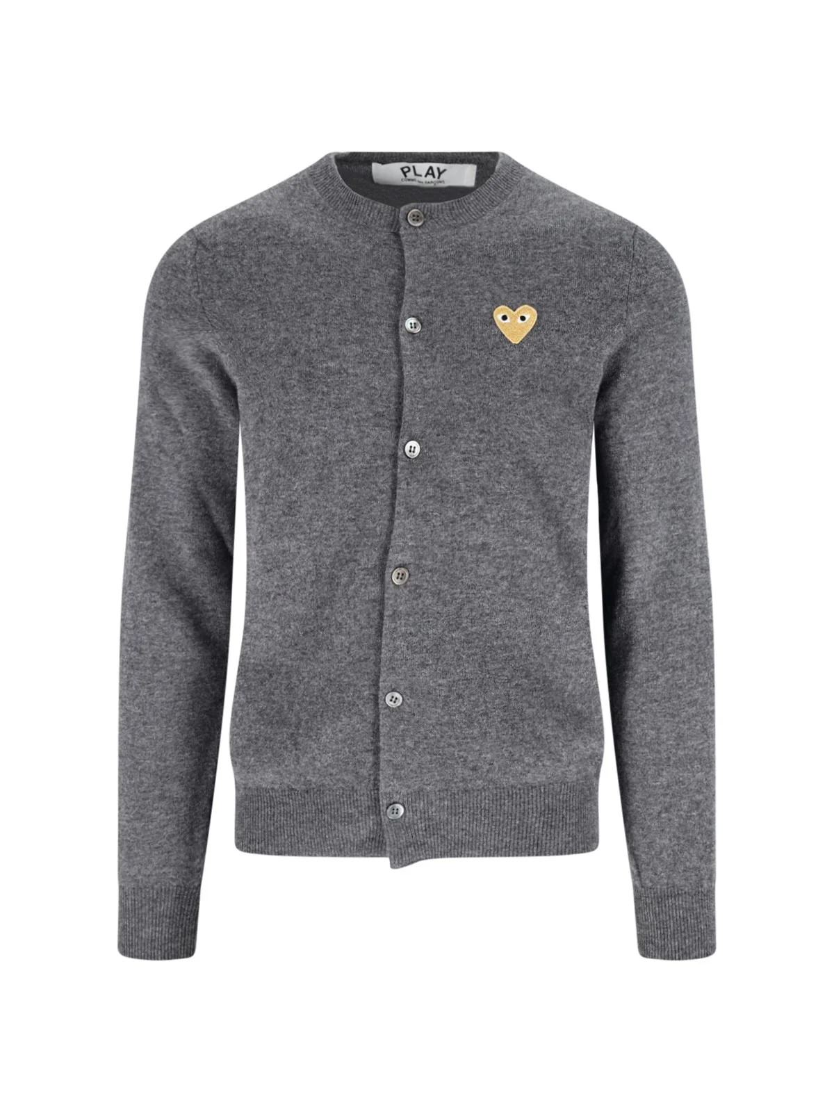 COMME DES GARCONS PLAY GREY WOOL CARDIGAN WITH ROUND NECKLINE, BUTTON CLOSURE, CONTRAST LOGO EMBROIDERY AT THE FRONT, RIBBED TRIMS, STRAIGHT HEM. PRODUCT INFO PRODUCT CODE AX N049 0513 COMPOSITION: 100% WOOL SIZE AND FIT: REGULAR FIT MADE IN: JAPAN