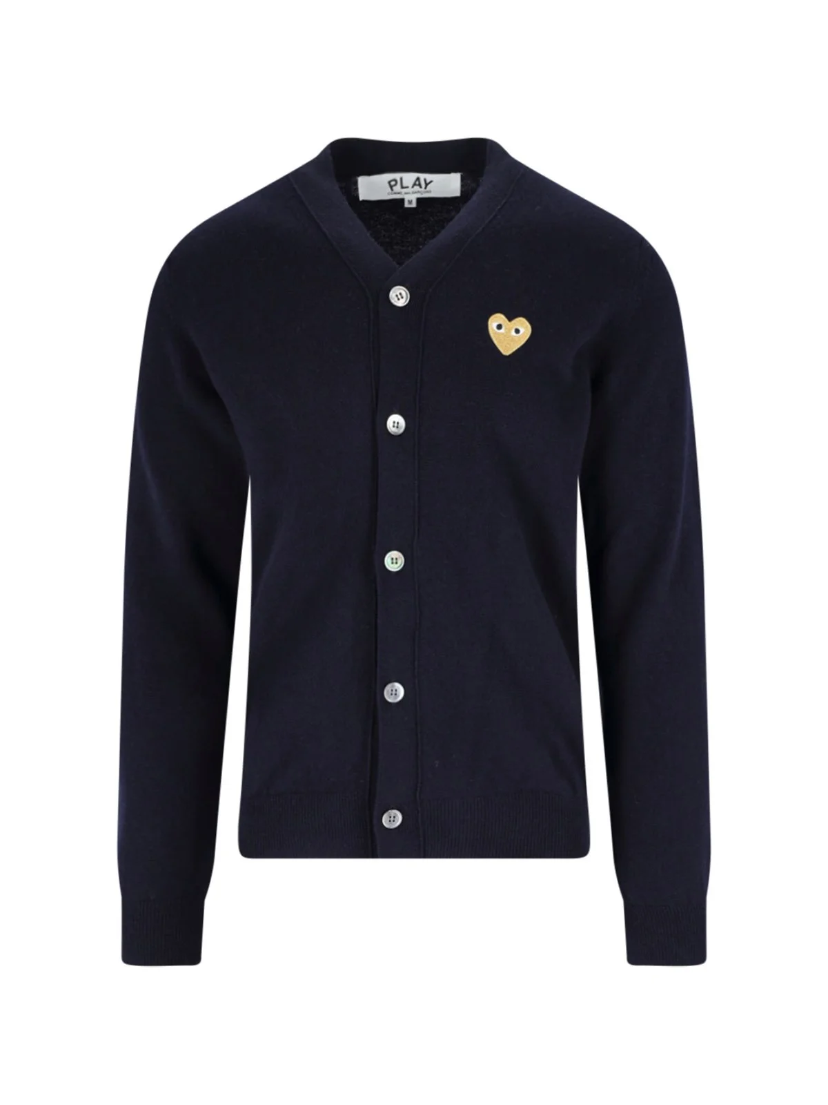 COMME DES GARCONS PLAY LOGO CARDIGAN IN NAVY BLUE WOOL WITH V-NECK, BUTTON CLOSURE, CONTRAST LOGO EMBROIDERY ON THE FRONT, RIBBED TRIM, STRAIGHT HEM. PRODUCT INFO PRODUCT CODE AX N050 0512 COMPOSITION: 100% WOOL SIZE AND FIT: REGULAR FIT MADE IN: JAPAN