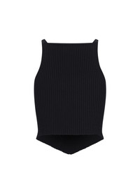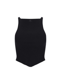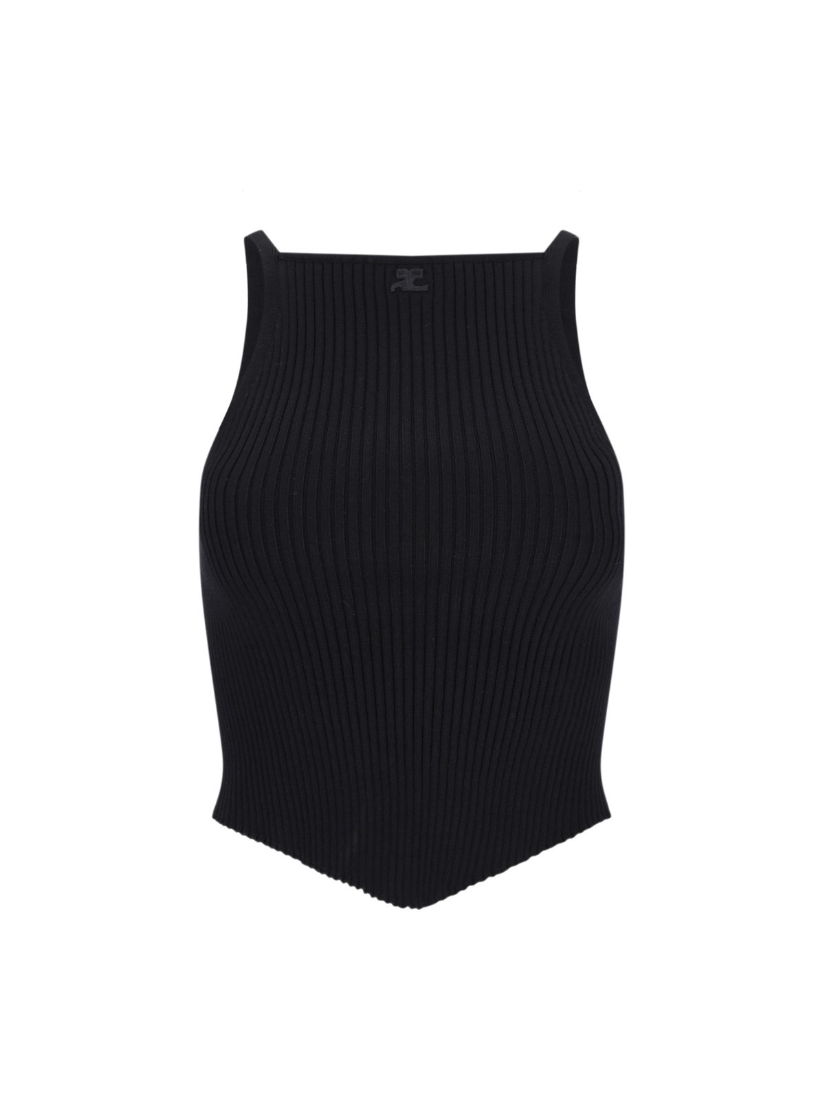 COURREGES KNIT TOP IN BLACK FABRIC WITH TONE-ON-TONE DETAILS, SQUARE NECKLINE, THIN STRAPS, SLEEVELESS, CHEST LOGO PATCH, AND SHORTER BACK HEM. PRODUCT INFO PRODUCT CODE VESMTO042FI00019999 COMPOSITION: 70% VISCOSE, 30% POLYESTER SIZE AND FIT: SLIM FIT MADE IN: BULGARIA
