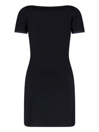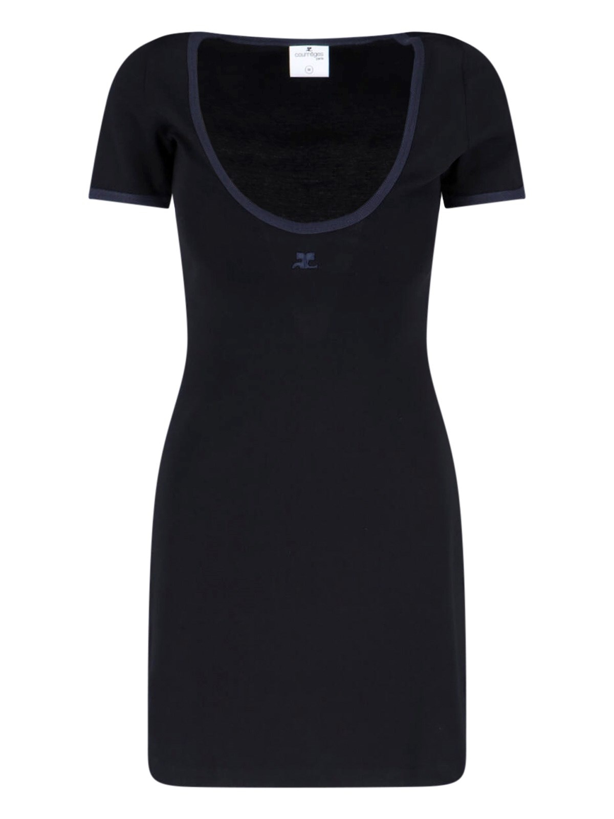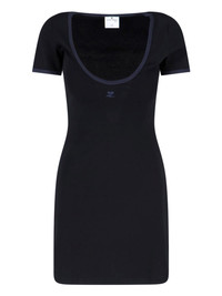COURREGES LOGO MINI DRESS IN BLACK COTTON WITH BLUE TRIM, RIBBED PATTERN, ROUND NECKLINE, SHORT SLEEVES, BLUE LOGO EMBROIDERY ON THE CHEST, FLARED HEM. PRODUCT INFO PRODUCT CODE 225JRO600JS0203B175 COMPOSITION: 100% COTTON SIZE AND FIT: REGULAR FIT MADE IN: PORTUGAL