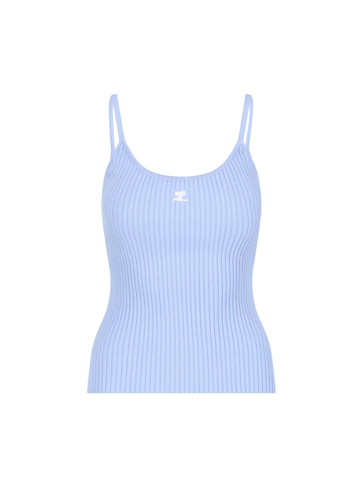 LIGHT BLUE COURRÈGES LOGO RIBBED TOP, FINE STRAPS, ROUND NECKLINE, WHITE LOGO PATCH DETAIL ON THE FRONT, STRAIGHT HEM. PRODUCT INFO PRODUCT CODE PERMDE012FI00017005 COMPOSITION: 70% VISCOSE, 30% POLYESTER SIZE AND FIT: SLIM MADE IN: BULGARIA