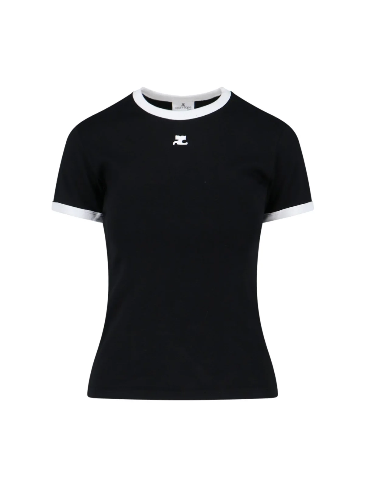 COURREGES LOGO T-SHIRT IN BLACK COTTON WITH CONTRAST DETAILS, CREW NECK, SHORT SLEEVES, CHEST LOGO PATCH, RIBBED TRIMS, STRAIGHT HEM. PRODUCT INFO PRODUCT CODE VESJTS017JS00709901 COMPOSITION: 100% COTTON SIZE AND FIT: REGULAR FIT MADE IN: PORTUGAL