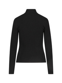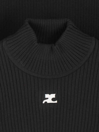 COURRÈGES BLACK TURTLENECK SWEATER IN RIBBED FABRIC WITH WHITE LOGO PATCH ON THE FRONT AND STRAIGHT HEM. PRODUCT INFO PRODUCT CODE PERMPU022FI00019999 COMPOSITION: 70% VISCOSE, 30% POLYESTER SIZE AND FIT: SLIM MADE IN: BULGARIA