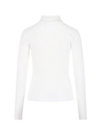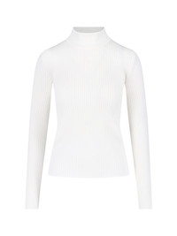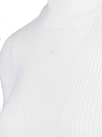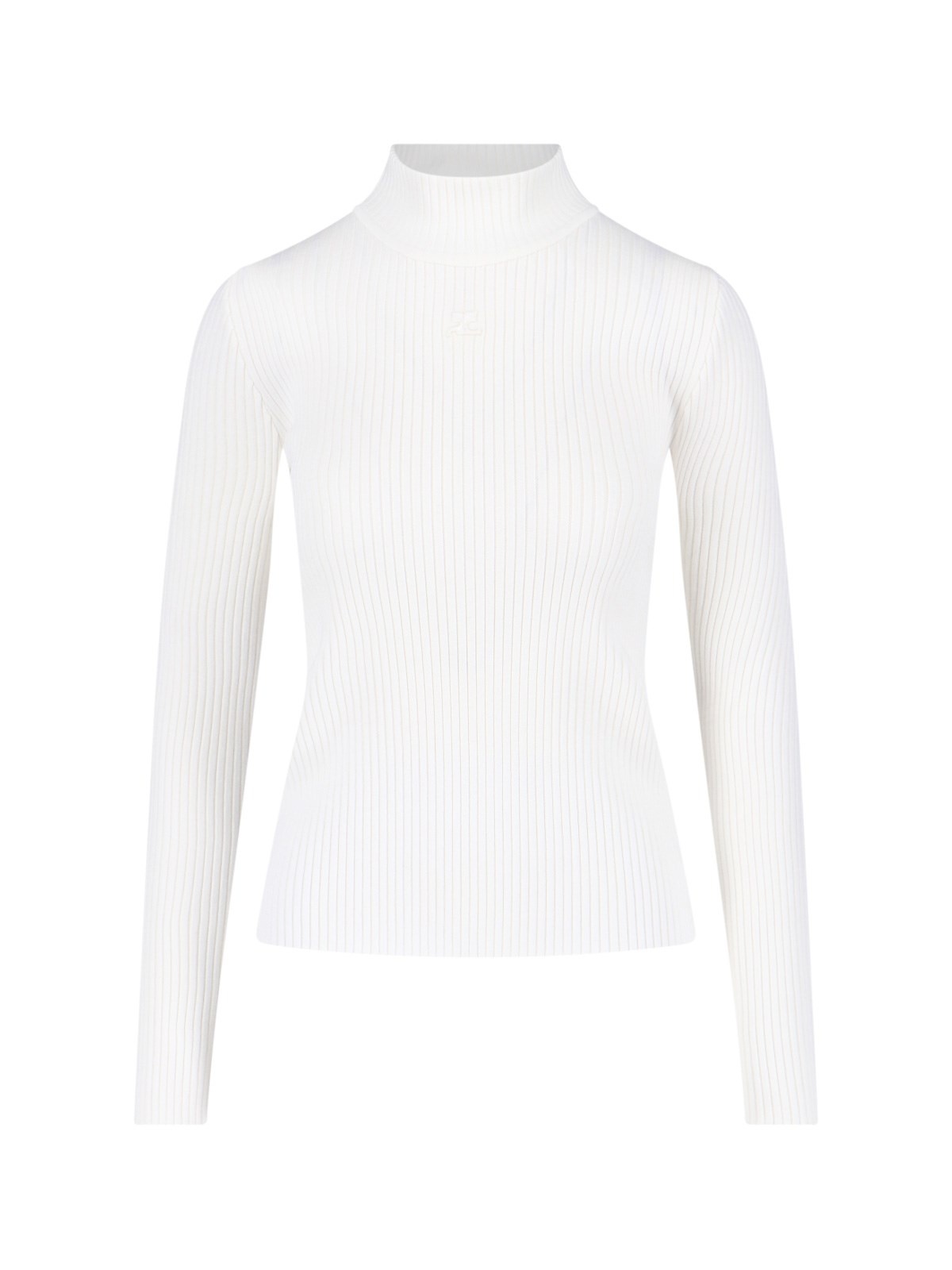 COURREGES WHITE TURTLENECK SWEATER IN RIBBED FABRIC WITH TONAL LOGO PATCH ON THE FRONT AND STRAIGHT HEM. PRODUCT INFO PRODUCT CODE PERMPU022FI00010001 MADE IN: BULGARIA - 70% VISCOSE, 30% POLYESTER - SLIM FIT