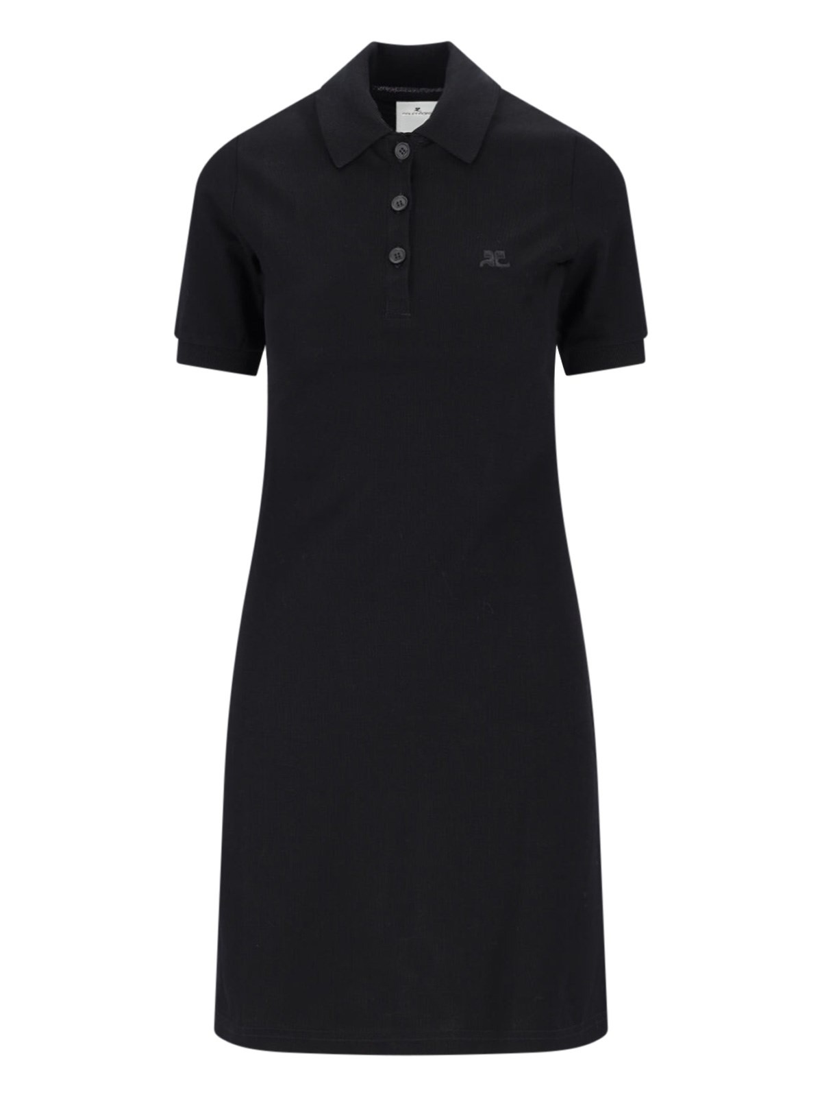 COURREGES BLACK COTTON POLO MINI DRESS WITH CLASSSIDE COLLAR, SHORT SLEEVES, BUTTON CLOSURE, TONE-ON-TONE "AC" EMBROIDERED LOGO, FLARED SKIRT, STRAIGHT HEM. PRODUCT INFO PRODUCT CODE 125JRO554JS01939999 COMPOSITION: 100% COTTON SIZE AND FIT: REGULAR FIT MADE IN: ITALY