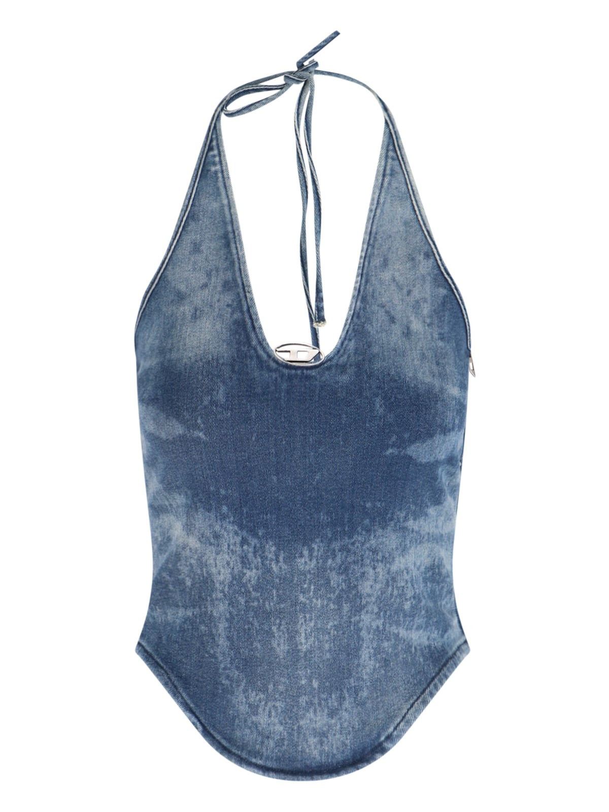 DIESEL "DE-JANICE-S" BLUE COTTON TOP WITH DISTRESSED WASH, V-NECK, THIN STRAPS, "OVAL-D" LOGO ON THE FRONT, CURVED HEM. PRODUCT INFO PRODUCT CODE A19027 09M9501 COMPOSITION: 97% COTTON, 2% EMENAL, 1% ELASTANE SIZE AND FIT: REGULAR FIT MADE IN: TUNISIA - PRODUCT MADE FROM RECYCLED MATERIALS