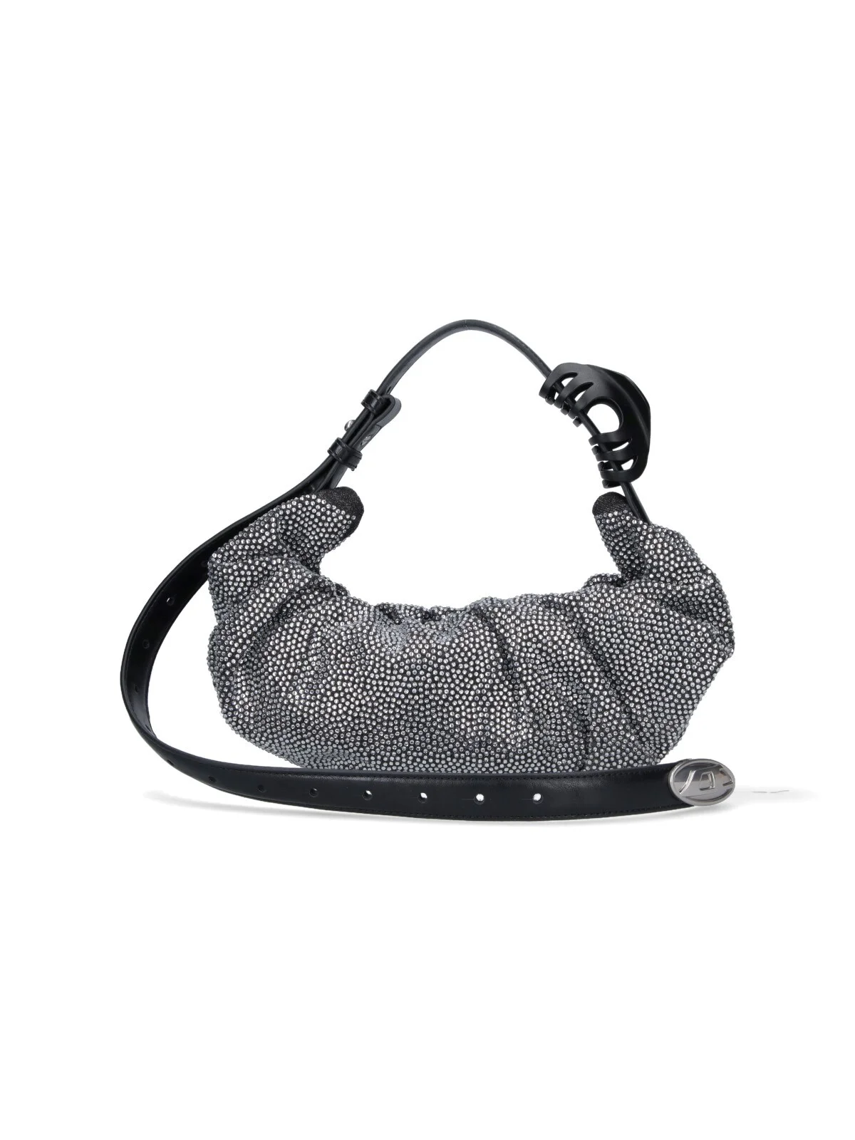 DIESEL 'GRAB-D' SHOULDER BAG IN BLACK COTTON BLEND WITH ALL-OVER CRYSTALS, ADJUSTABLE SHOULDER STRAP, ZIP CLOSURE, HAIR PLIERS DETAIL, SILVER METAL HARDWARE DETAIL ON THE SHOULDER STRAP, MAIN INNER COMPARTMENT. PRODUCT INFO PRODUCT CODE X10479 P8641T8013 COMPOSITION: 75% COTTON, 25% POLYURETHANE SIZE AND FIT: H 26 X W 30 X D 10 CM MADE IN: CHINA - HANDLE DROP: 21 CM