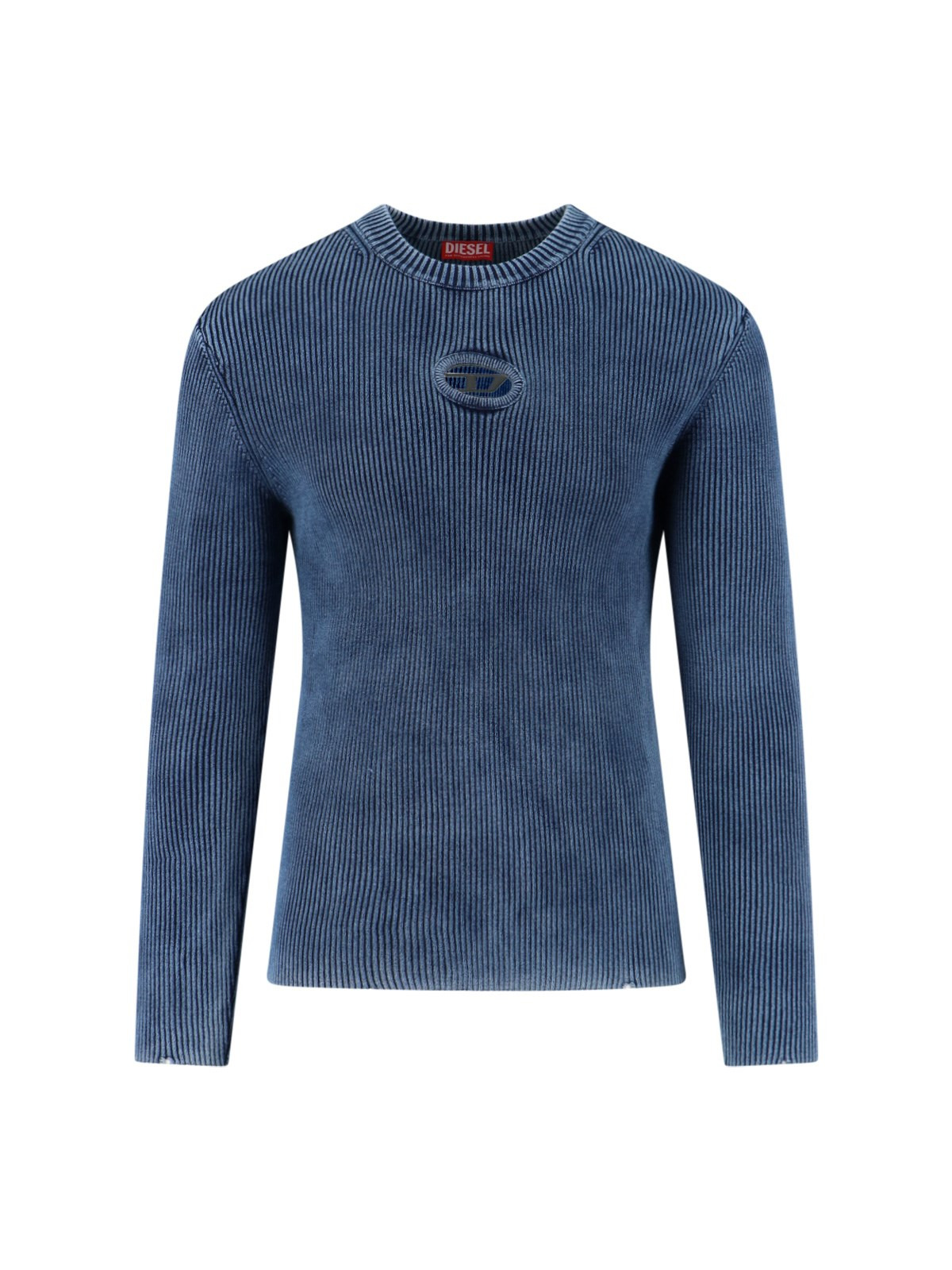 DIESEL 'K-DARIN' BLUE COTTON SWEATER WITH DISTRESSED WASH, CREW NECK, 'D-OVAL' LOGO ON THE FRONT, CUT-OUT DETAIL, DESTROYED TRIMS, STRAIGHT HEM. PRODUCT INFO PRODUCT CODE A17512 0ANAH8AT COMPOSITION: 100% COTTON SIZE AND FIT: SLIM FIT MADE IN: ITALY - PRODUCT MADE FROM RECYCLABLE MATERIALS