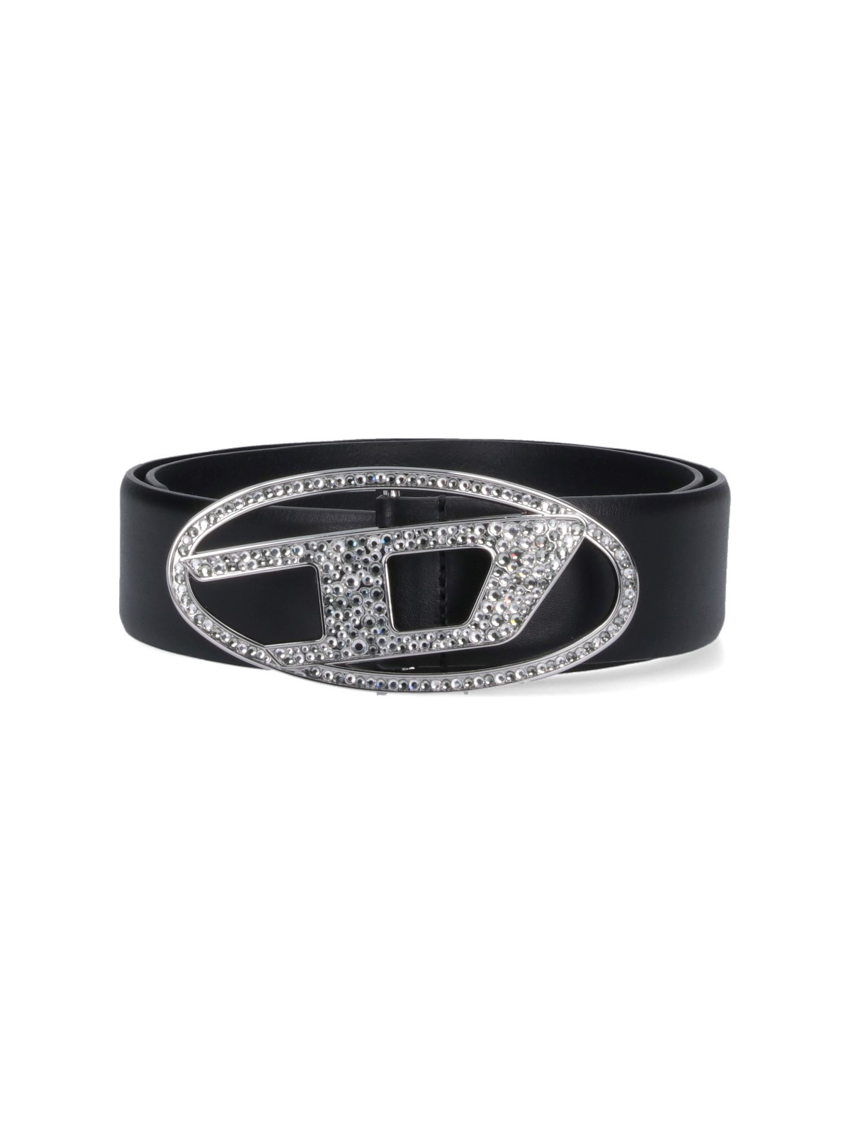 DIESEL 'B-1DR' RHINESTONE LOGO BELT IN BLACK LEATHER WITH SILVER METAL OVAL D LOGO BUCKLE, ALL-OVER SILVER RHINESTONE APPLIQUÉ DETAIL, ADJUSTABLE. PRODUCT INFO PRODUCT CODE X09611 P6364T8013 COMPOSITION: 100% LEATHER SIZE AND FIT: HEIGHT 4 CM MADE IN: ITALY - TRIMS: 100% CRYSTALS