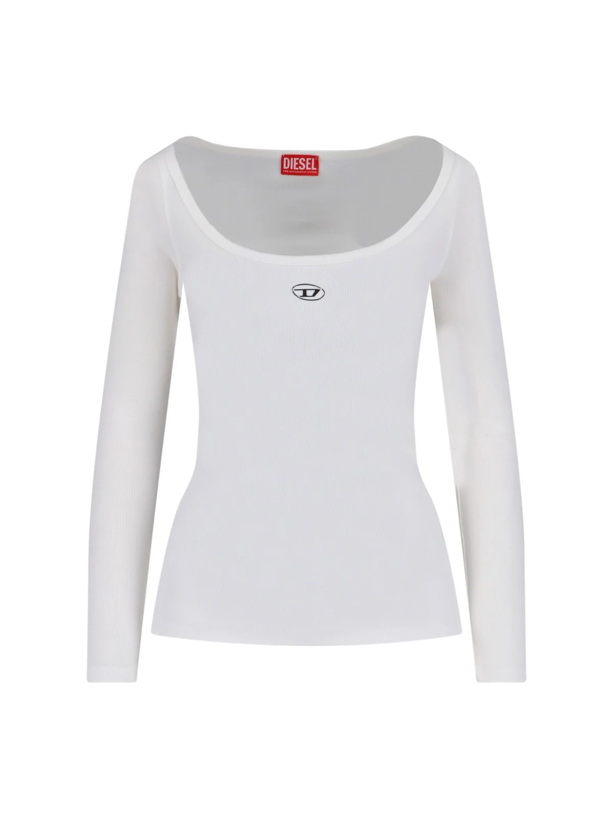 DIESEL 'T-BAL-OD' RIBBED KNIT IN WHITE ORGANIC COTTON WITH ROUND NECKLINE, LONG SLEEVES, SILVER METAL 'OVAL D' LOGO ON THE FRONT, STRAIGHT HEM. PRODUCT INFO PRODUCT CODE A19909 0JMBA141 COMPOSITION: 94% ORGANIC COTTON, 6% ELASTANE SIZE AND FIT: SLIM FIT MADE IN: CHINA - PRODUCT MADE FROM ORGANIC MATERIALS