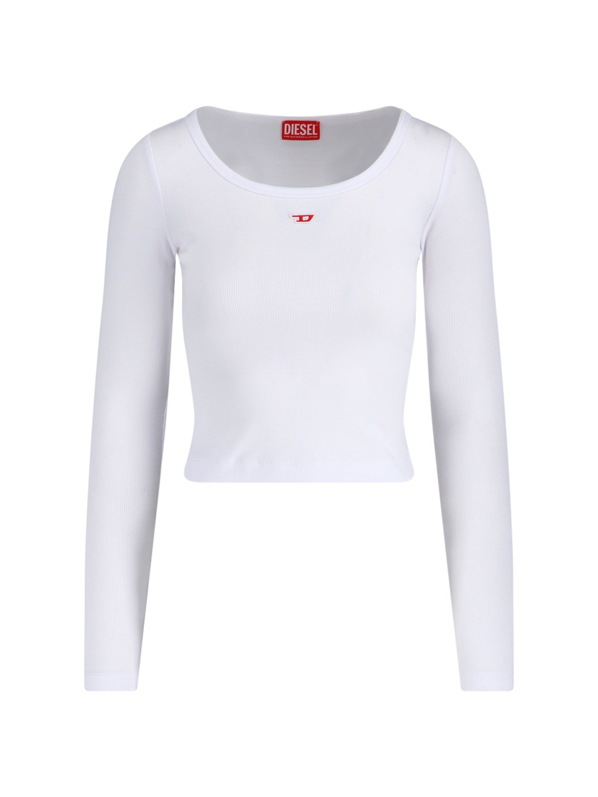 DIESEL 'T-BALLET-D' CROP TOP IN WHITE ORGANIC COTTON WITH RIBBED PATTERN, CREW NECK, LONG SLEEVES, LOGO EMBROIDERY ON THE CHEST, STRAIGHT HEM. PRODUCT INFO PRODUCT CODE A05106 0EJAI100 COMPOSITION: 94% COTTON, 6% ELASTANE SIZE AND FIT: SLIM FIT MADE IN: CHINA - PRODUCT MADE FROM ORGANIC RAW MATERIALS