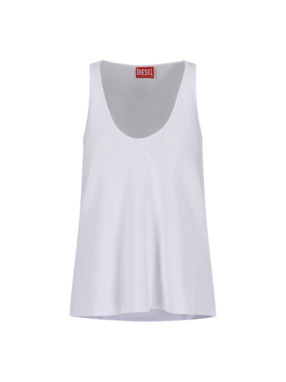 DIESEL T-LPSYA-LKDS TOP IN WHITE ORGANIC COTTON WITH RIBBED KNIT, PLUNGING NECKLINE, TONE-ON-TONE OVAL-D EMBROIDERED LOGO ON THE FRONT, AND STRAIGHT HEM. PRODUCT INFO PRODUCT CODE A21573 0JEAI100 COMPOSITION: 96% ORGANIC COTTON, 4% ELASTANE SIZE AND FIT: SOFT FIT MADE IN: BULGARIA