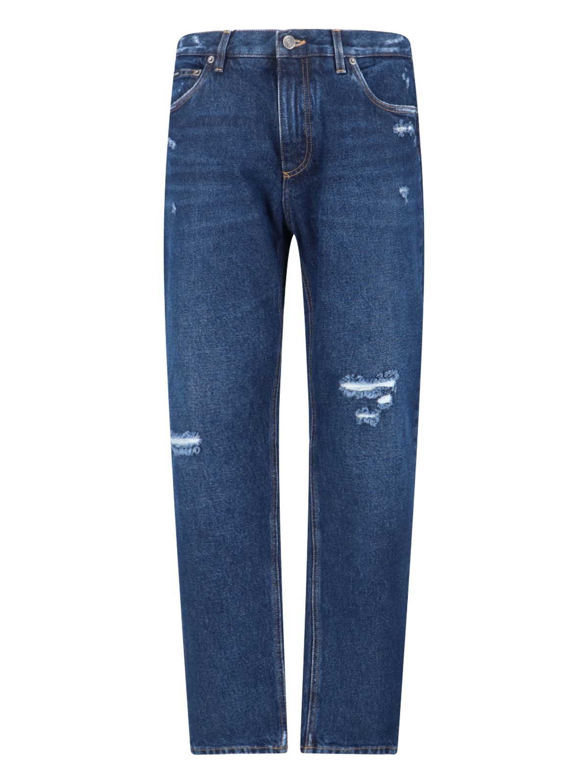 DOLCE & GABBANA "BOYFRIEND" BLUE COTTON JEANS WITH USURED EFFECT, FIVE-POCKET DESIGN, BELT LOOPS, BUTTON AND ZIP CLOSURE, SILVER METAL LOGO ON THE BACK, STRAIGHT LEG. PRODUCT INFO PRODUCT CODE GYJDAD G8NK6S9001 COMPOSITION: 100% COTTON SIZE AND FIT: REGULAR FIT MADE IN: ITALY - TRIMS: 100% METAL
