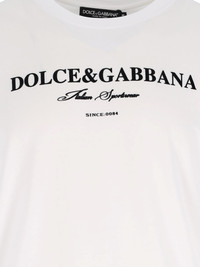 DOLCE & GABBANA WHITE COTTON CREW NECK T-SHIRT WITH SHORT SLEEVES, CONTRASTING CHEST LOGO PRINT, STRAIGHT HEM. PRODUCT INFO PRODUCT CODE G8RN8T G7O9YW0800 COMPOSITION: 100% COTTON SIZE AND FIT: REGULAR FIT MADE IN: ITALY