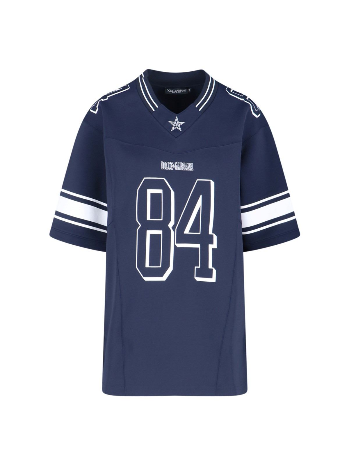DOLCE&GABBANA BLUE FABRIC T-SHIRT WITH V-NECK, RIBBED KNIT, DROPPED SHOULDERS, MAXI LOGO PRINT ON THE FRONT AND BACK, STRAIGHT HEM. PRODUCT INFO PRODUCT CODE F8V97Z GDDHOS8000 COMPOSITION: 90% POLYAMIDE, 10% ELASTANE SIZE AND FIT: OVERSIZED FIT MADE IN: ITALY