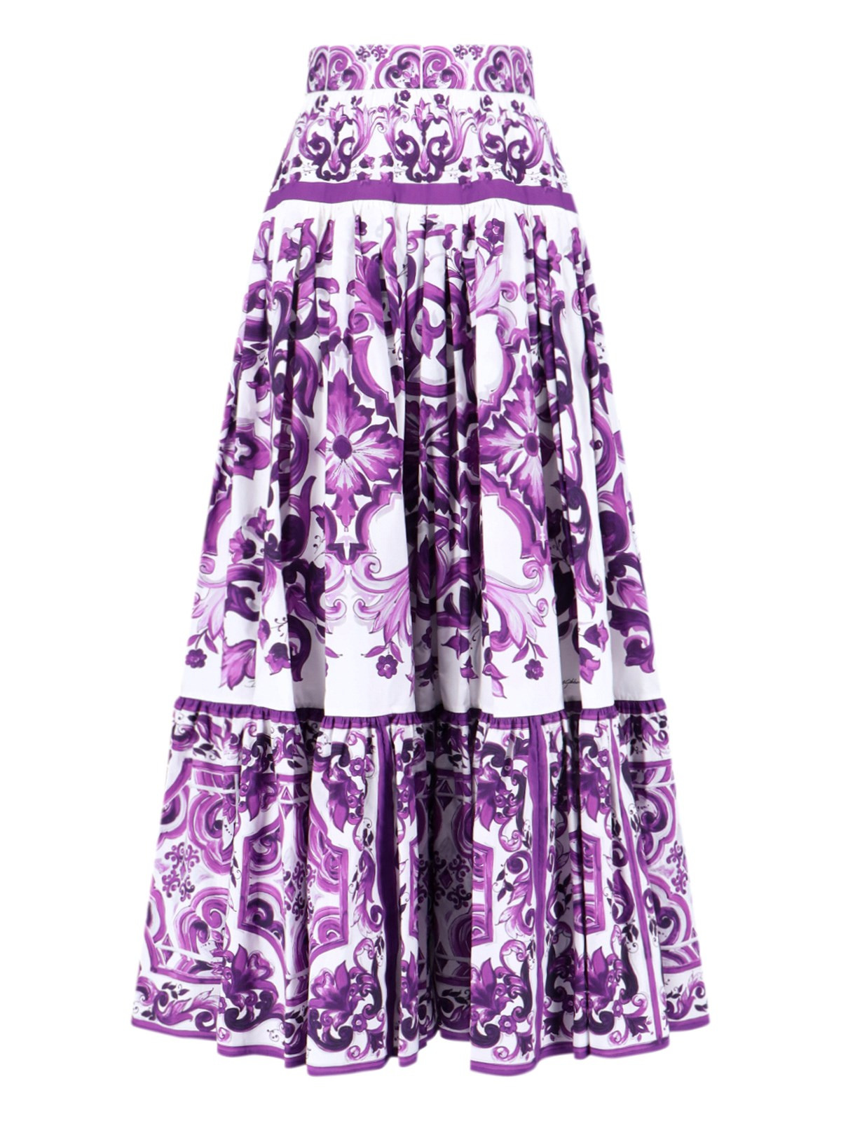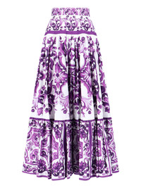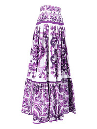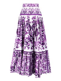 DOLCE & GABBANA MAXI PLEATED SKIRT IN PURPLE COTTON, HIGH WAIST, MAJOLICA PRINT PATTERN, ZIP AND HOOK CLOSURE AT THE BACK, STRAIGHT HEM. PRODUCT INFO PRODUCT CODE F4CX0T HH5EWIP3TN COMPOSITION: 100% COTTON SIZE AND FIT: REGULAR FIT MADE IN: ITALY