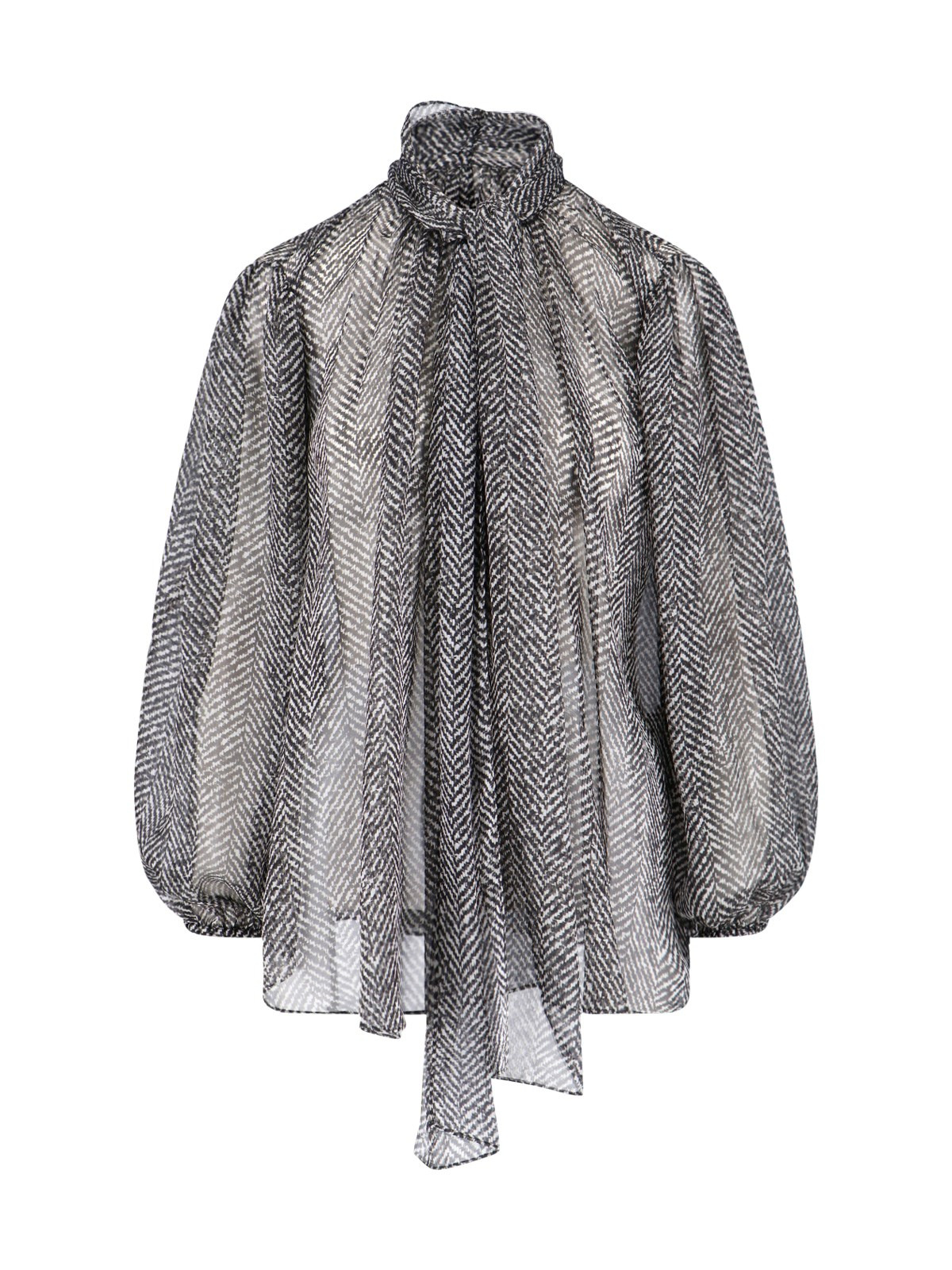 DOLCE & GABBANA BLACK SILK CHIFFON SHIRT WITH CHEVRON PATTERN, BACK BUTTON CLOSURE, SCARF ON THE NECK, WIDE SLEEVES, ENRICHMENT DETAIL AT THE BACK, ELASTICATED CUFFS, STRAIGHT HEM. PRODUCT INFO PRODUCT CODE F5R62T IS1ZNHH5QS COMPOSITION: 100% SILK SIZE AND FIT: REGULAR FIT MADE IN: ITALY