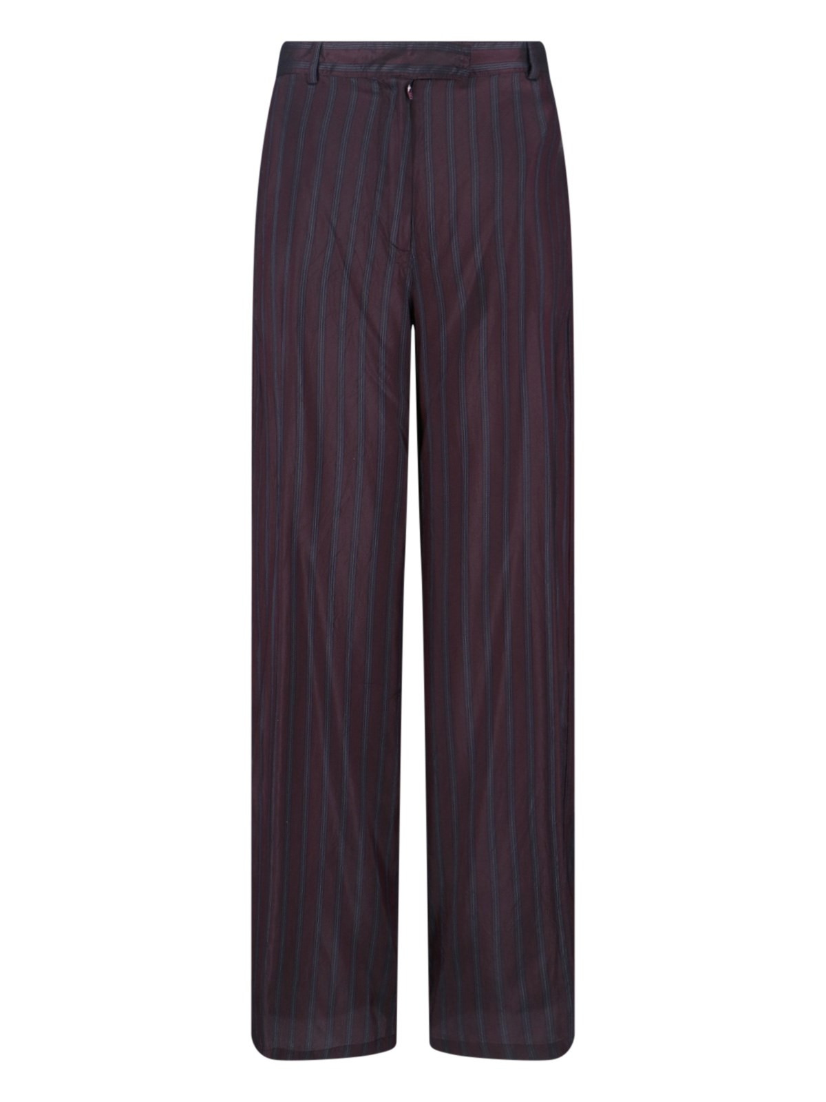 DRIES VAN NOTEN WIDE TROUSERS IN BURGUNDY CUPRO WITH BLUE STRIPED PRINT PATTERN, HIGH WAIST, BELT LOOPS, HOOK AND ZIP CLOSURE, TWO SIDE POCKETS, TWO BACK WELT POCKETS, WIDE LEG. PRODUCT INFO PRODUCT CODE 010946 2267358 COMPOSITION: 100% CUPRO SIZE AND FIT: REGULAR FIT MADE IN: ROMANIA